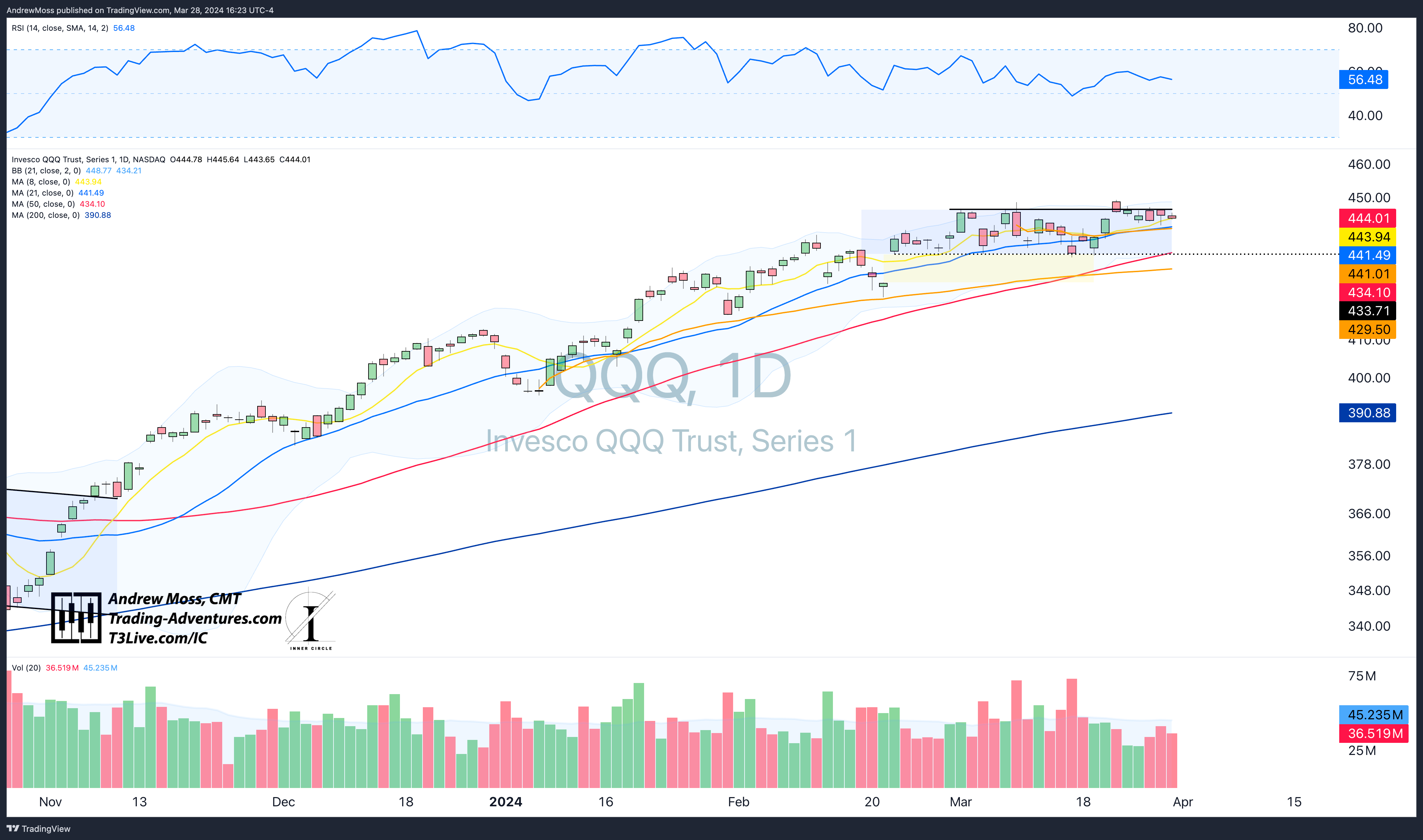 QQQ has spent the week just under the closing high—$446.38—while the 8 and 21-day MAs rise underneath.