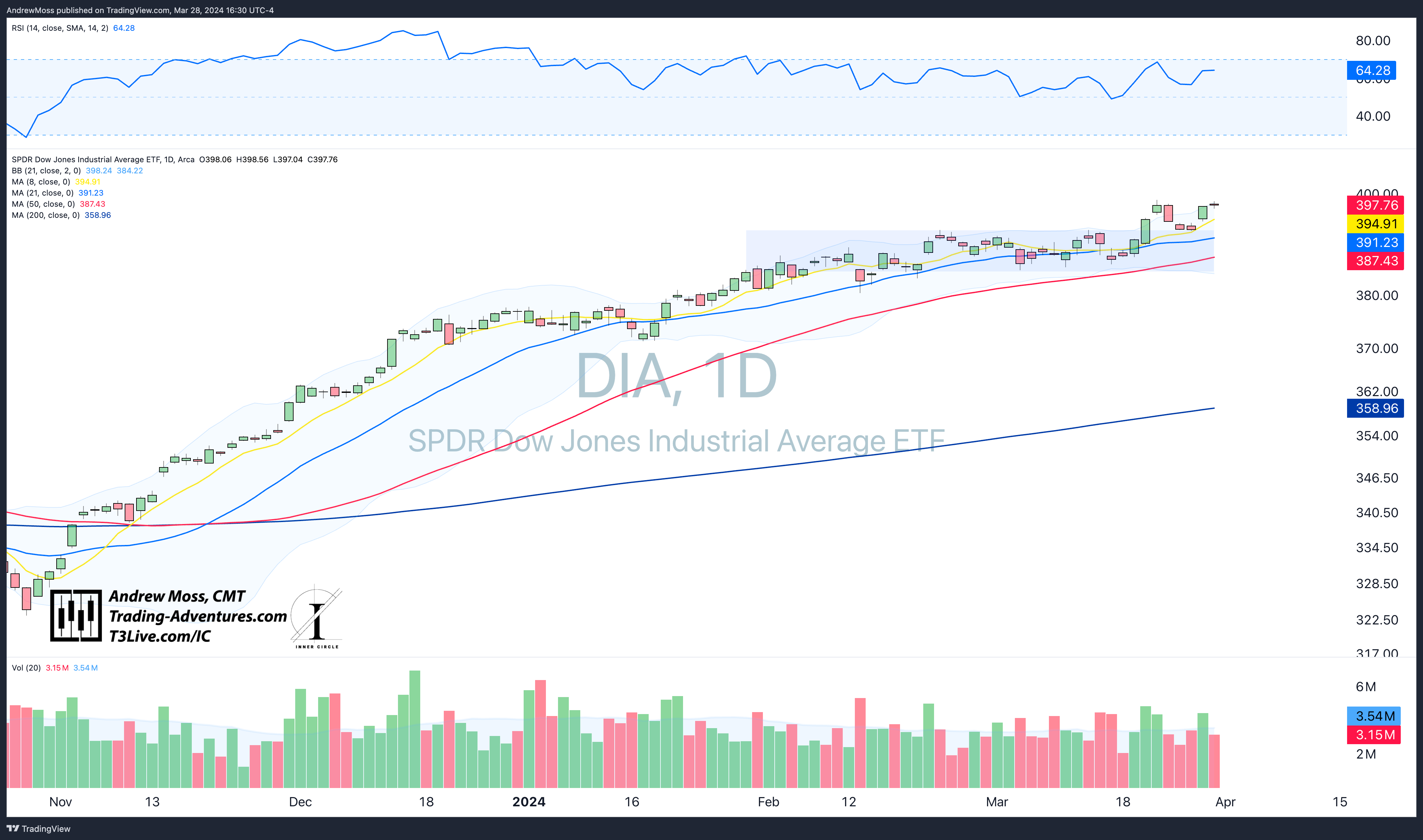 DIA spent a few days digesting the breakout move before returning to new highs. It closed one penny higher today than it did one week ago.