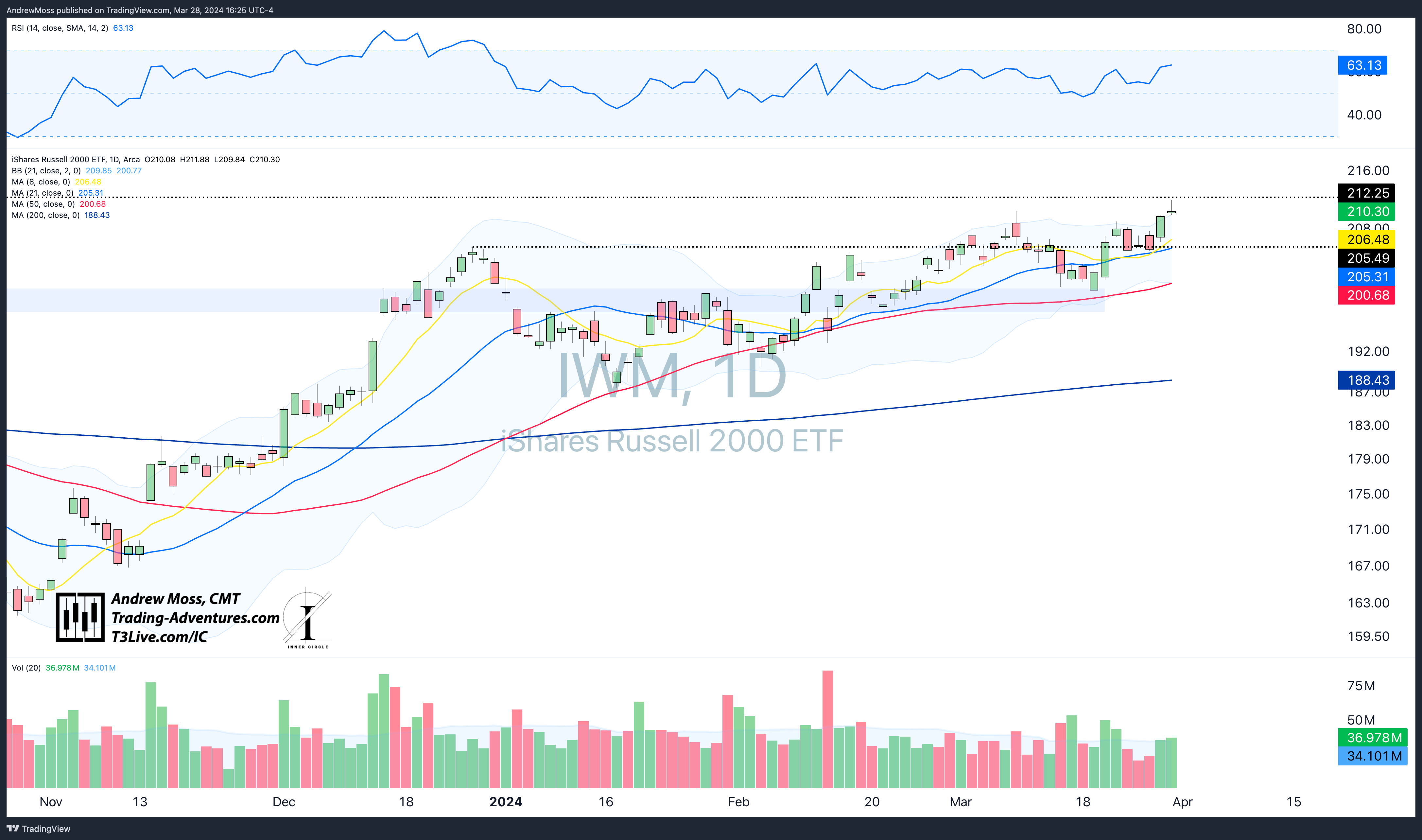 IWM made good progress higher this week before finding resistance near the $212.25 pivot today. That level dates back two years to March 29, 2022.