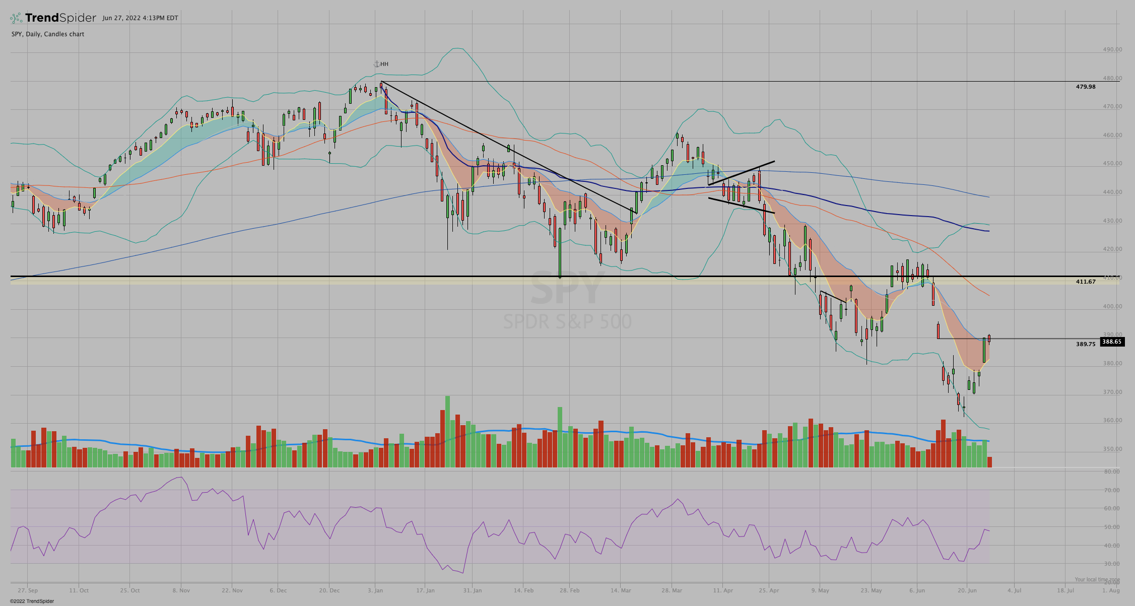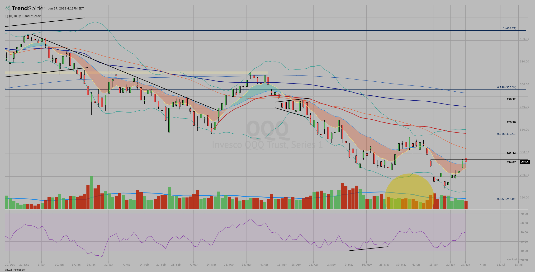 If all of those things can happen then keep an eye on the June 9 lows and the gap fill. If prices fail then watch the 8-day EMAs and the Friday lows very closely.