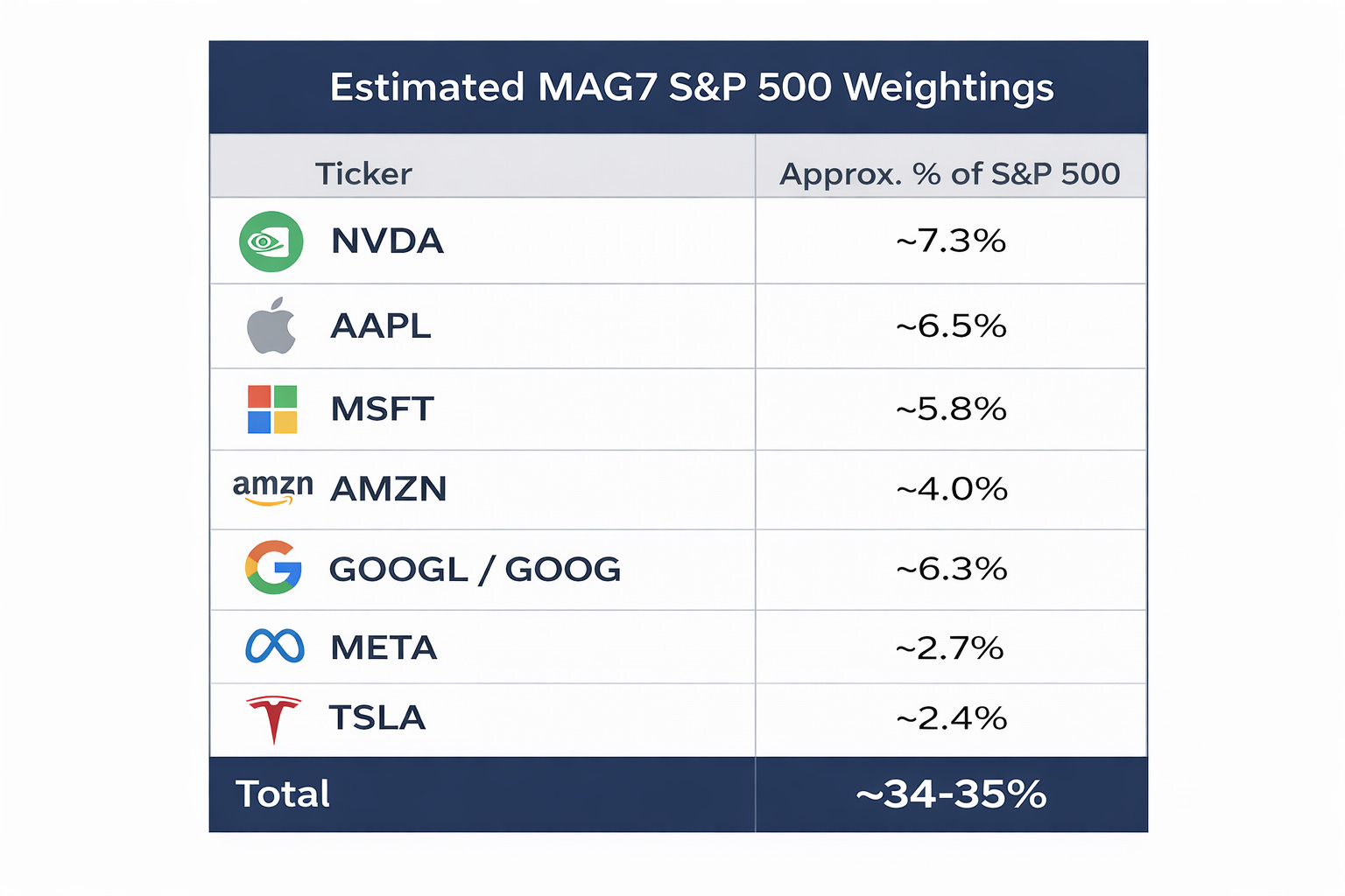 The Magnificent Seven—Apple, Microsoft, Nvidia, Amazon, Alphabet, Meta, and Tesla—still make up ~35% of the S&P 500.
