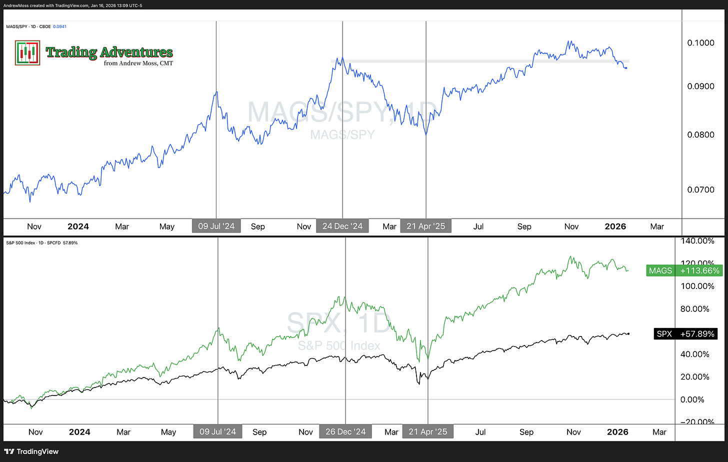 The MAGS/SPY ratio (top panel) has been consolidating for months and is now showing signs of breakdown. Sure, that breakdown could continue—possibly pulling the broader market down with it.