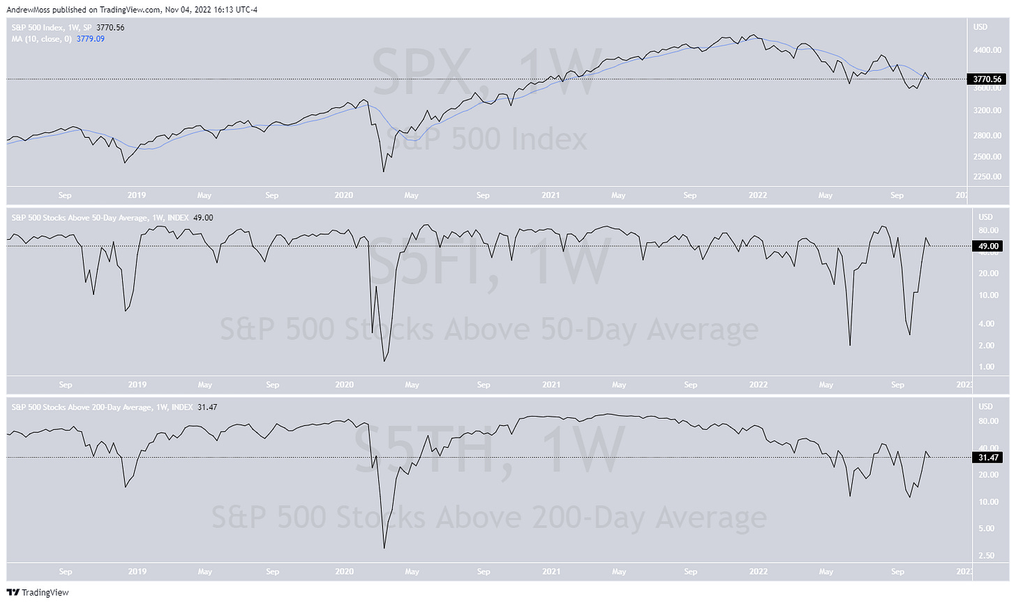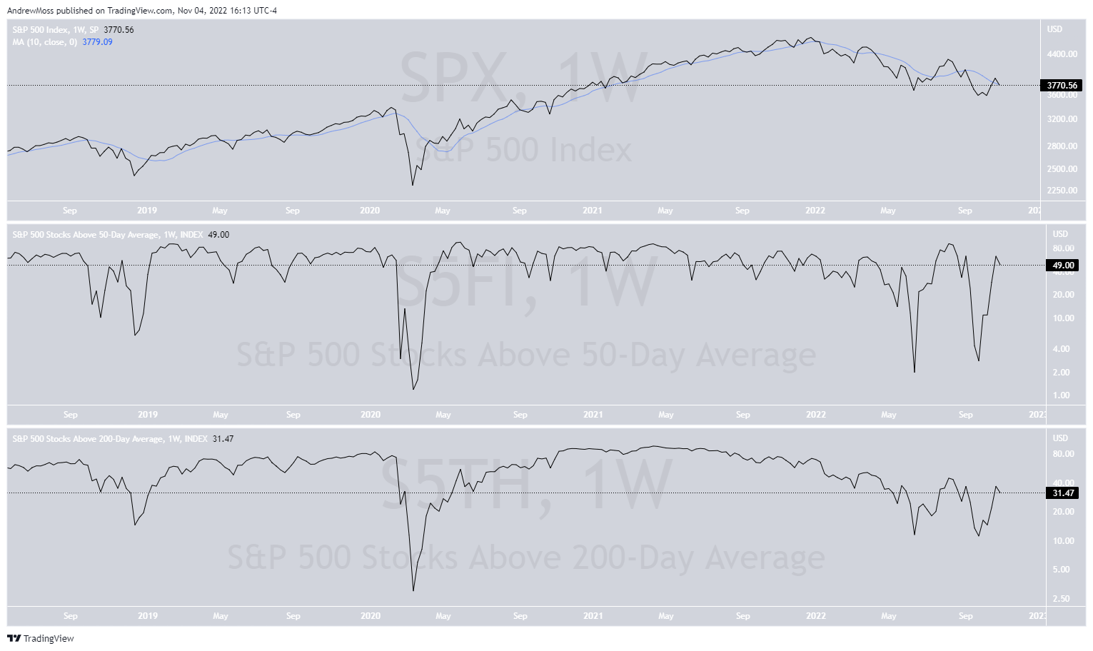 The number of $SPX stocks over the 50/200 day MA has risen.