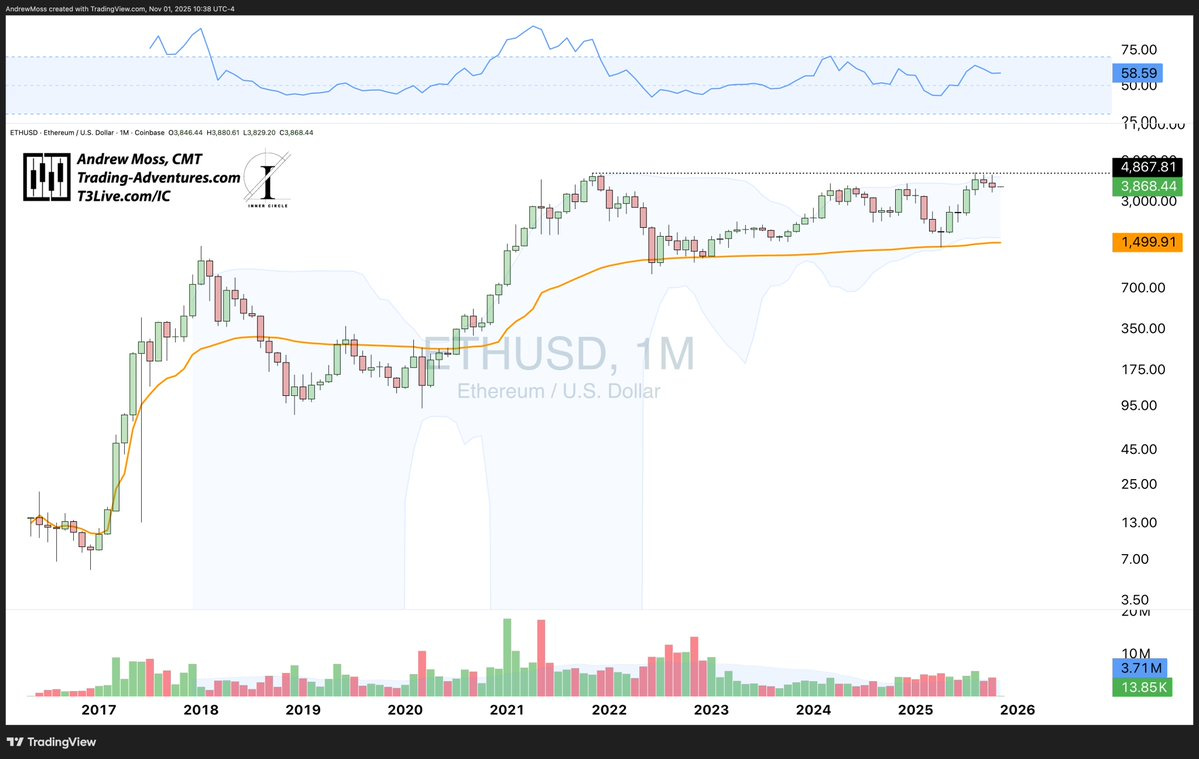 ETH Ethereum has also been unable to break higher. Now three months of tight consolidation after grazing the $4867 pivot in August.