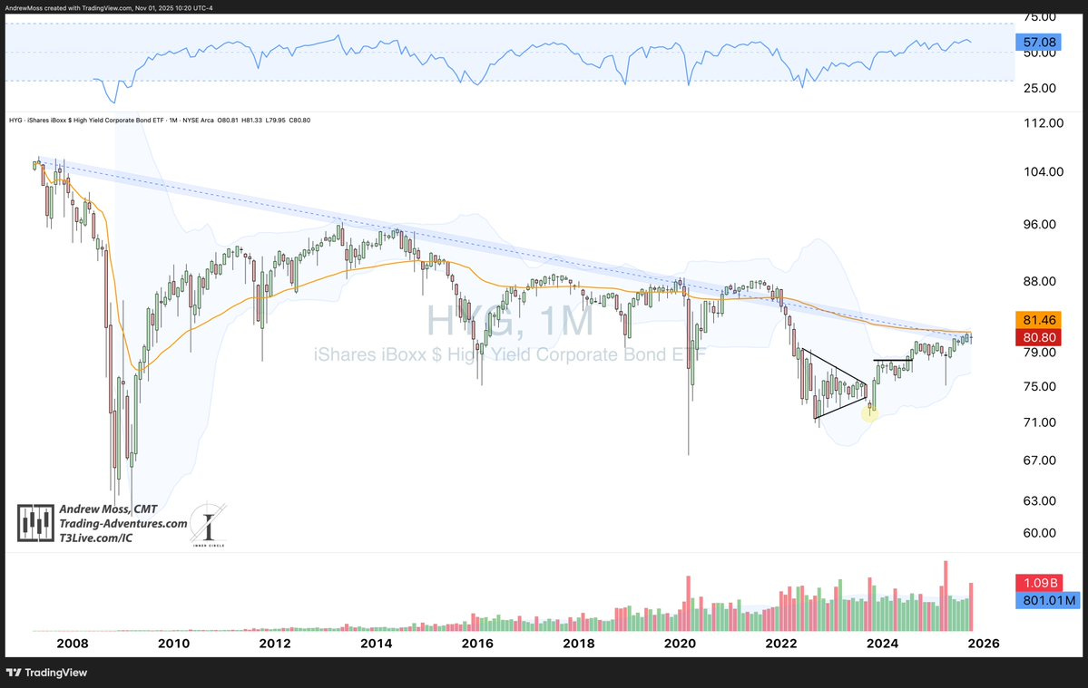HYG is pressing into a key zone — a multi-decade trendline and AVWAP🟠 from inception. A strong breakout here could shift the tone for credit markets.