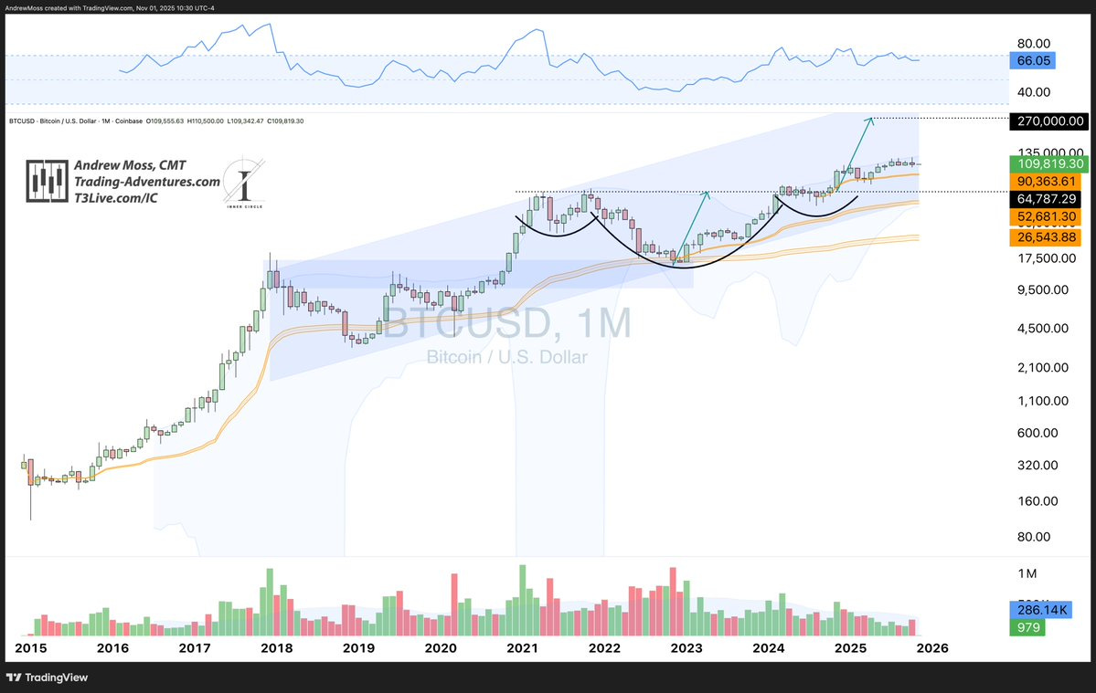 The monthly is cruising along near the upper reaches of the long channel, dragging the Bollinger Bands higher with it.