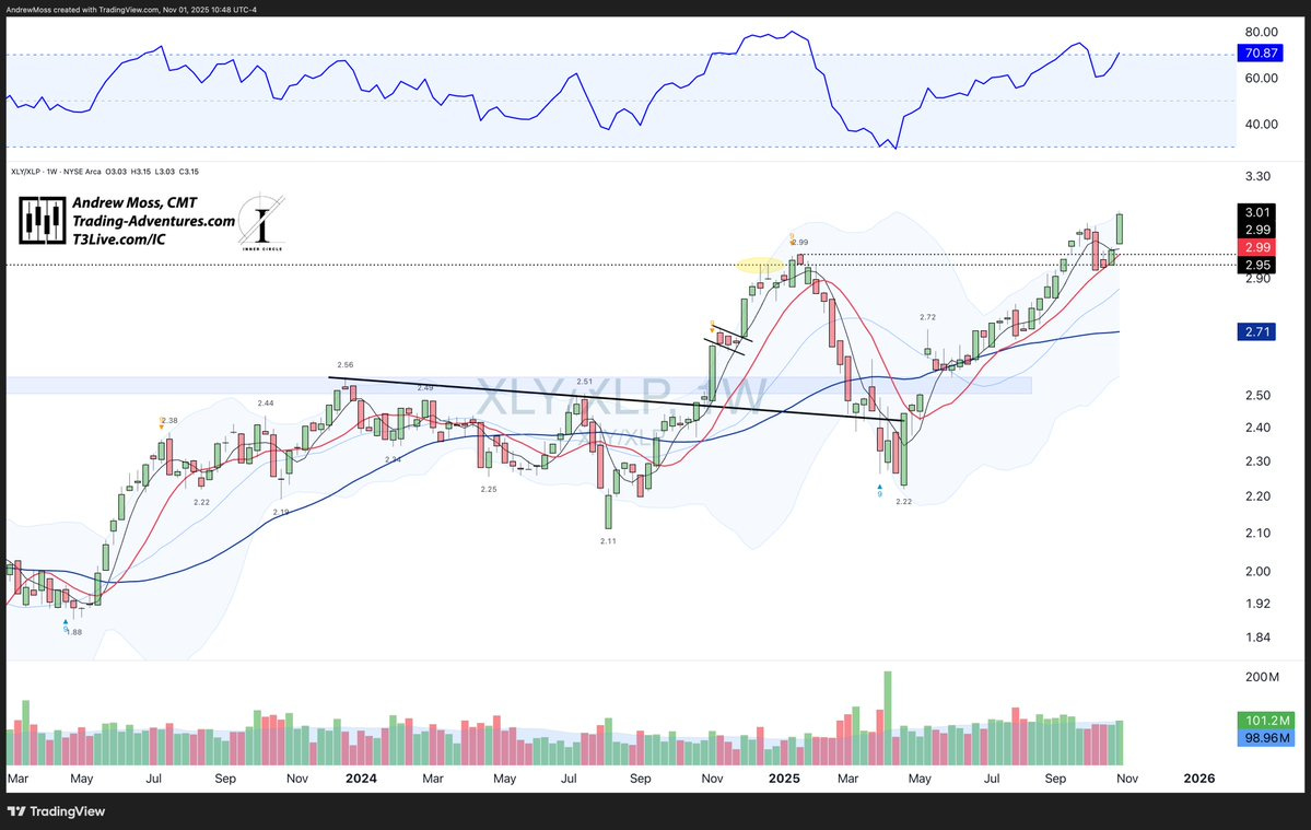 XLY / XLP Consumer Discretionary vs. Staples also with an impressive breakout, taking it back to new highs.