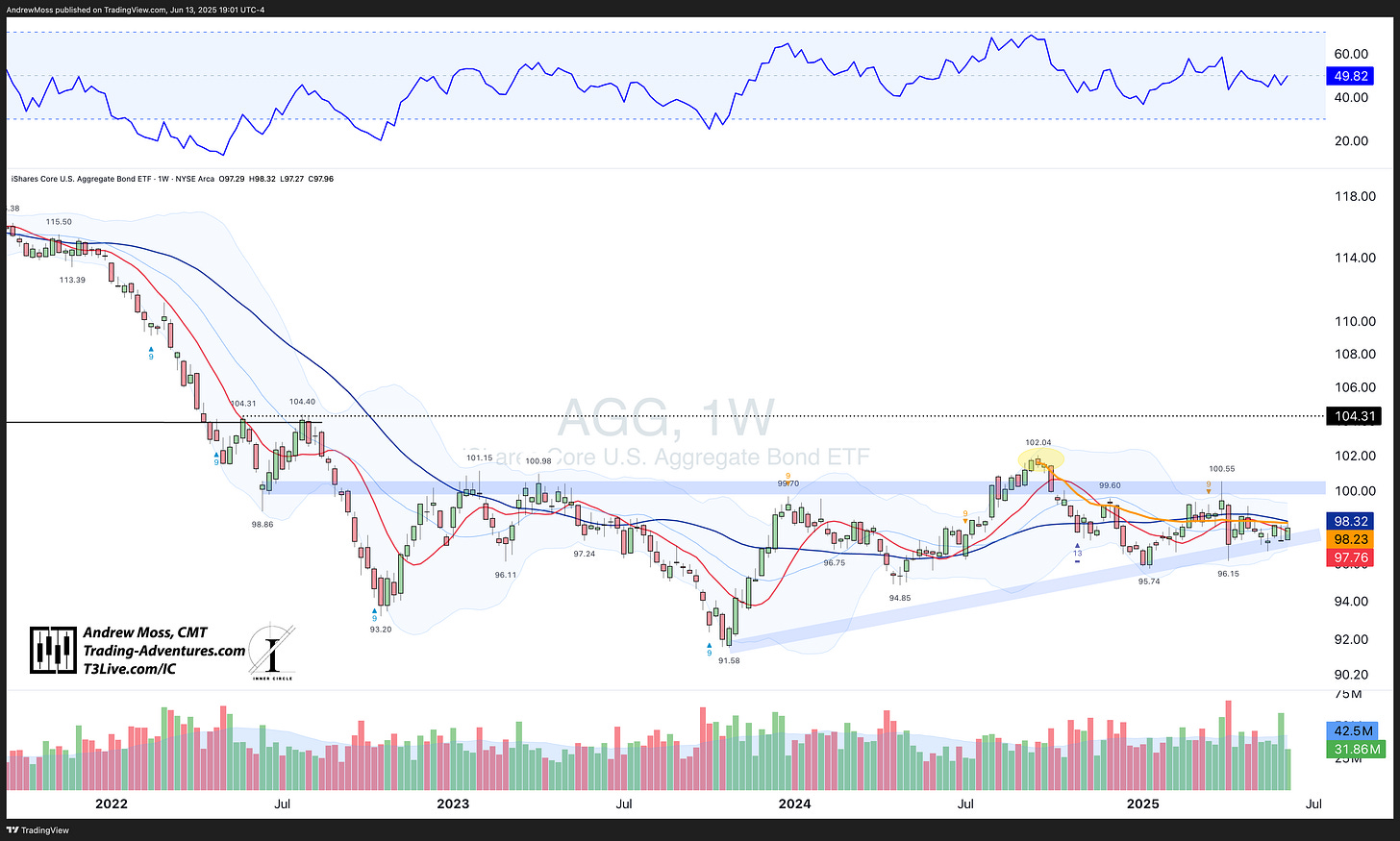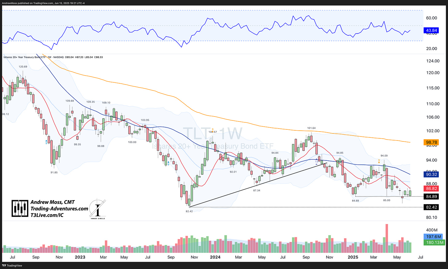 Caught a bid on the flight-to-safety trade. Briefly reclaimed the 40-week MA and pivot high AVWAP before backing off.
