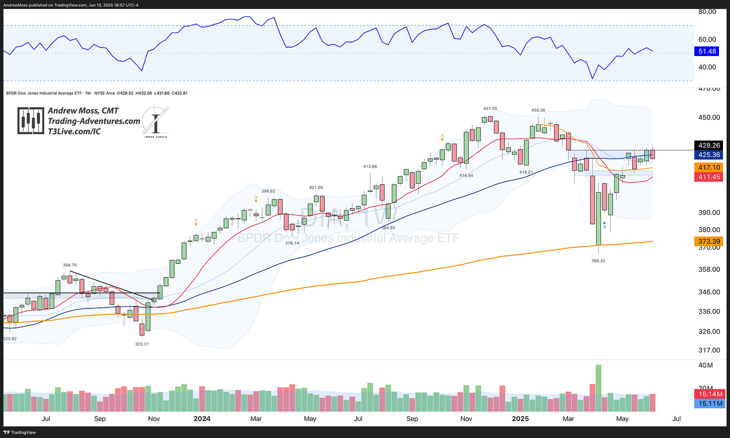 DIA remains below its 40-week MA after failing again at the ~428 resistance zone.