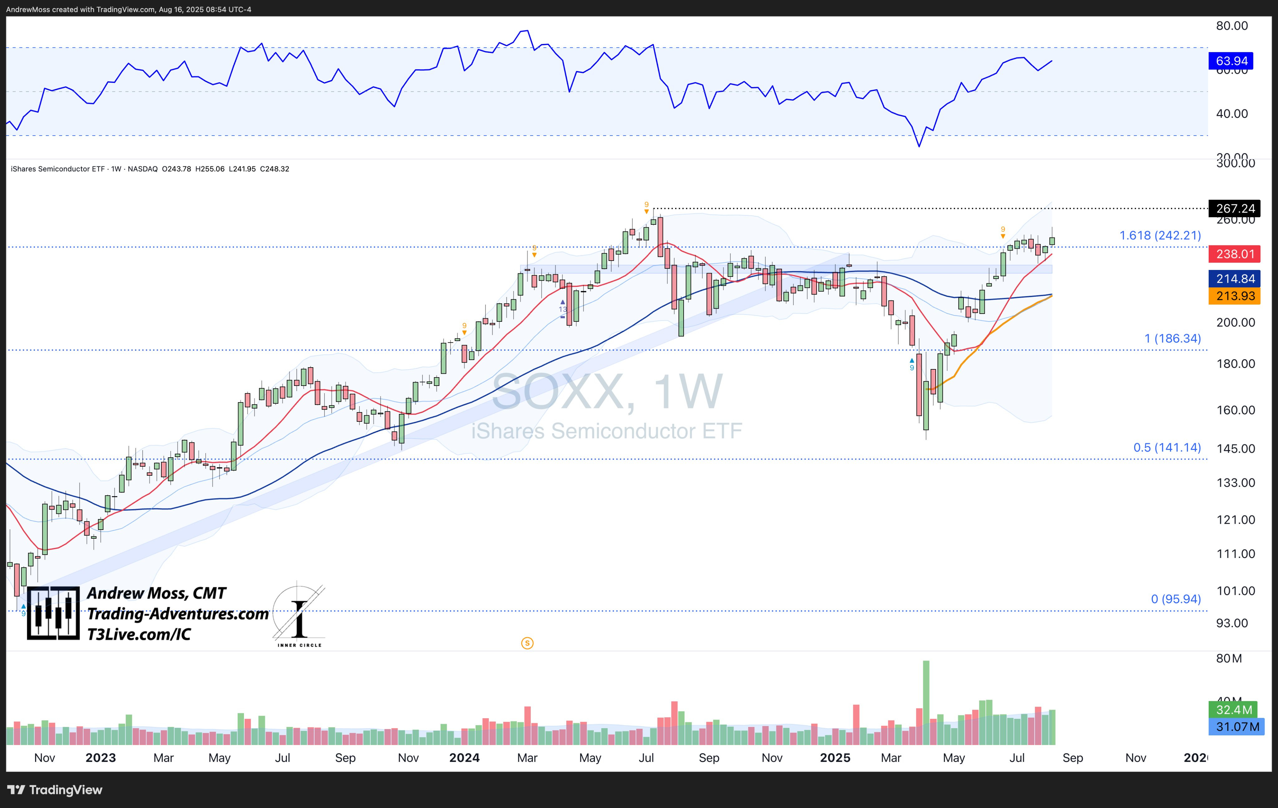 Held the 10-week MA and sits at the 1.618 extension. Semis remain key.