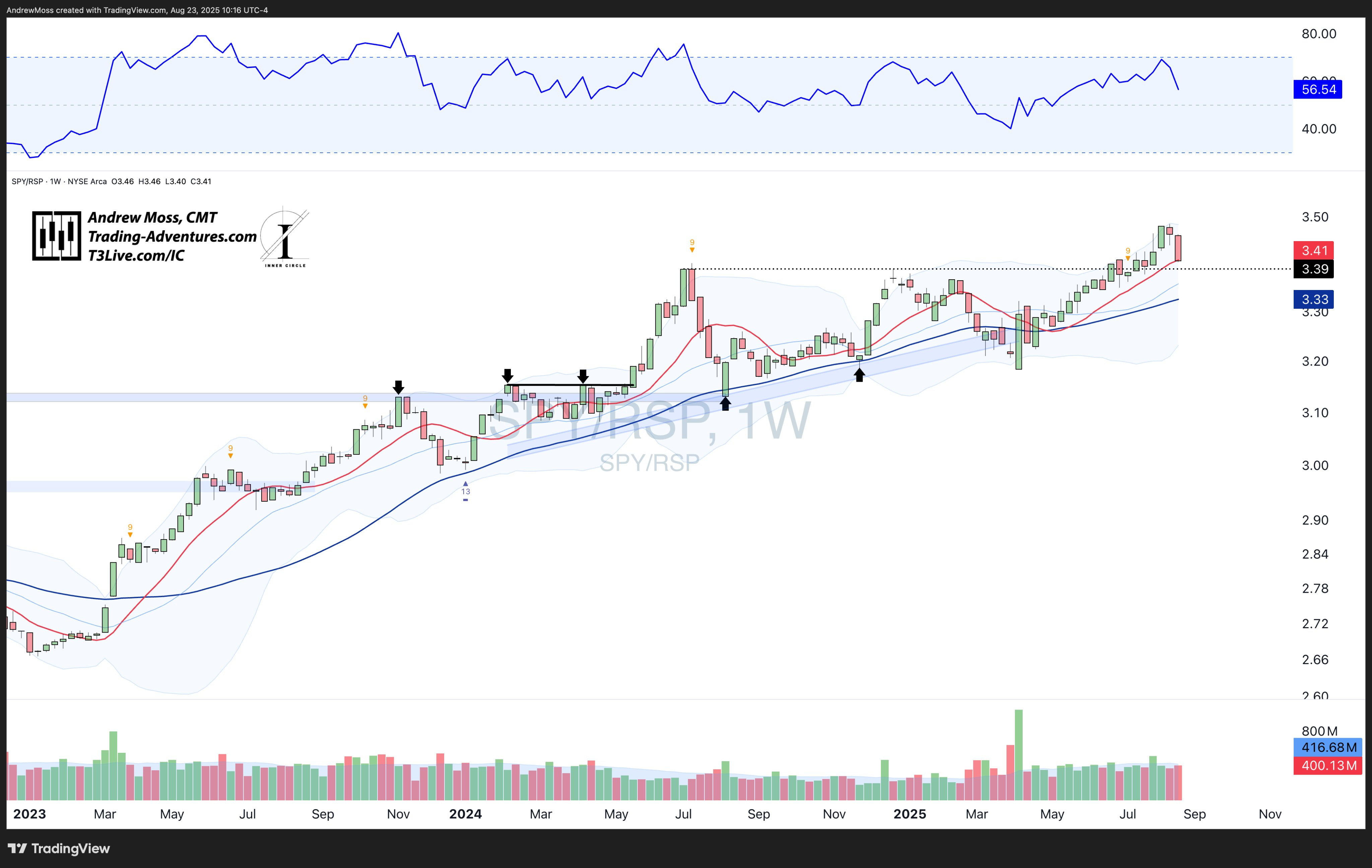SPY/RSP and QQQ/QQEW are both showing signs that smaller names are gaining traction.