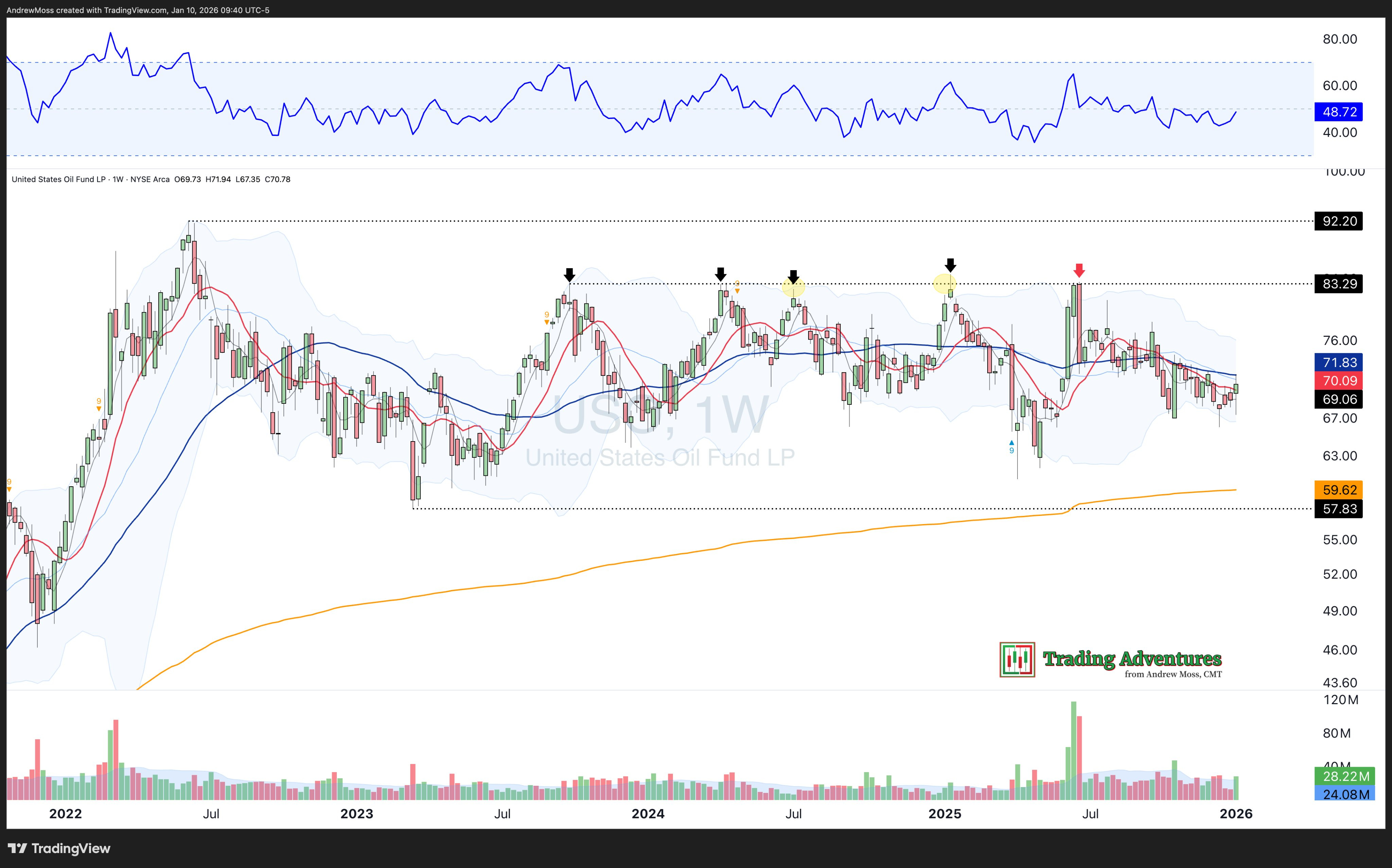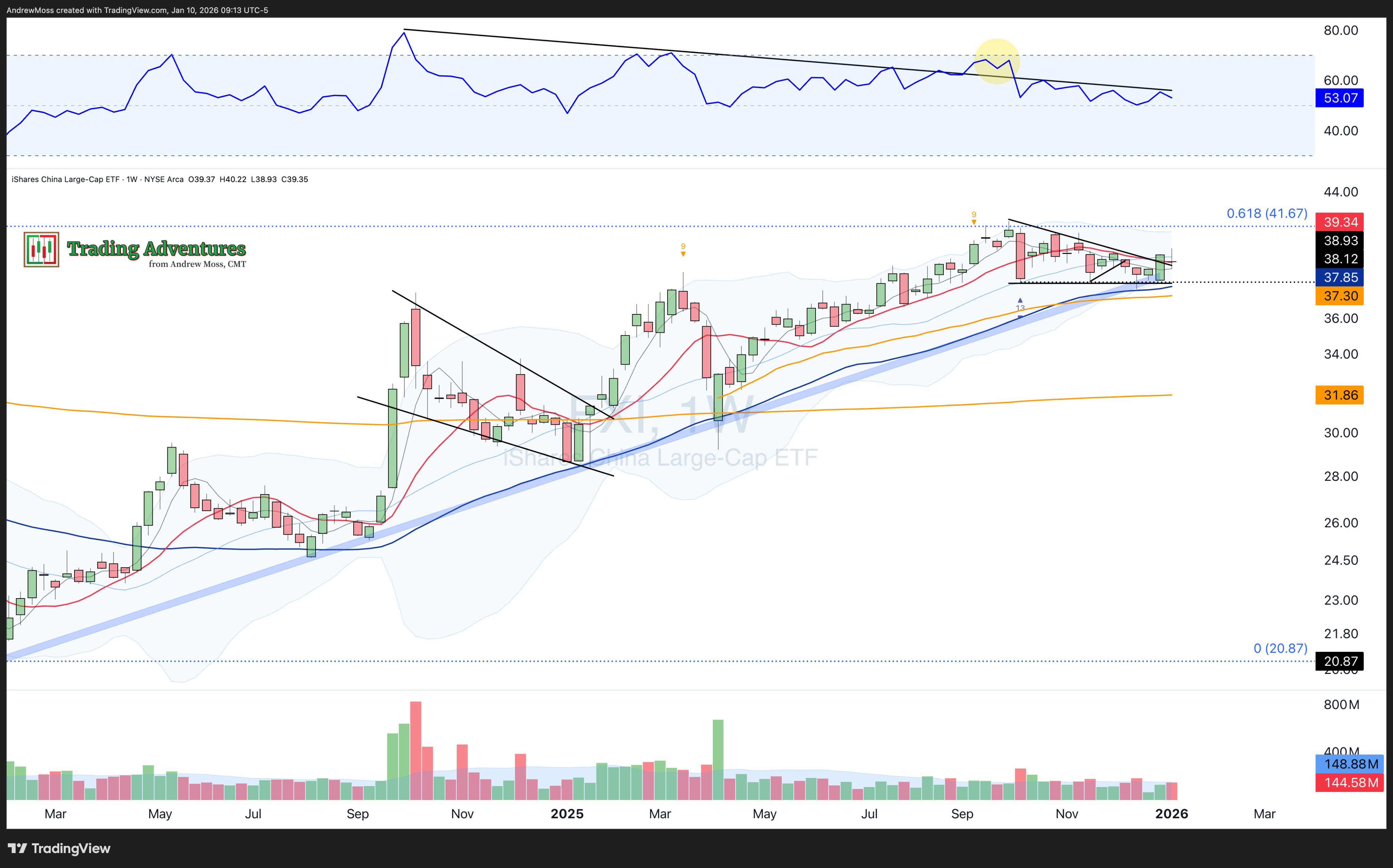 FXI didn’t participate this week. It’s not broken — but price stalled below recent highs, with congestion near key moving averages and tightening Bollinger Bands.