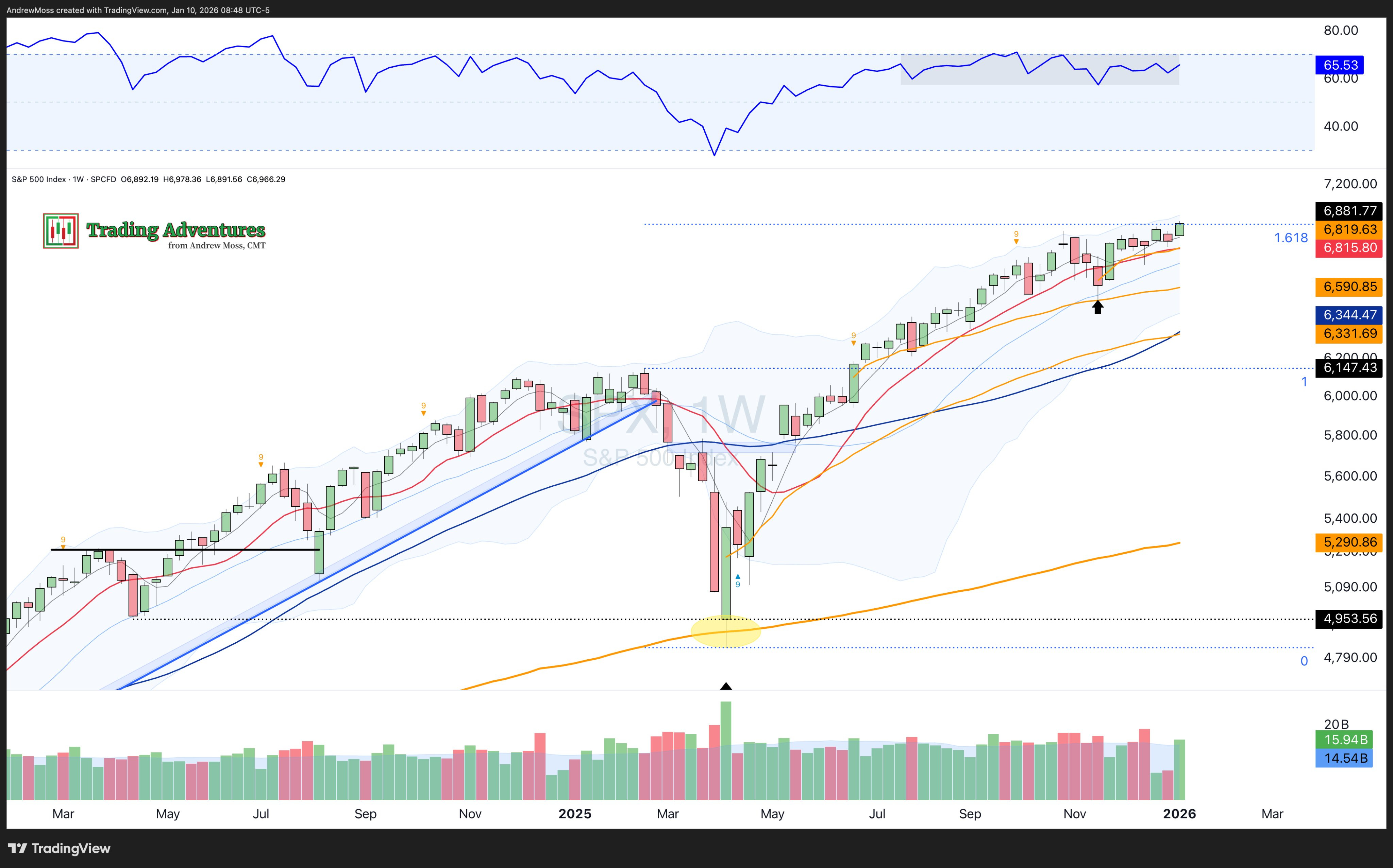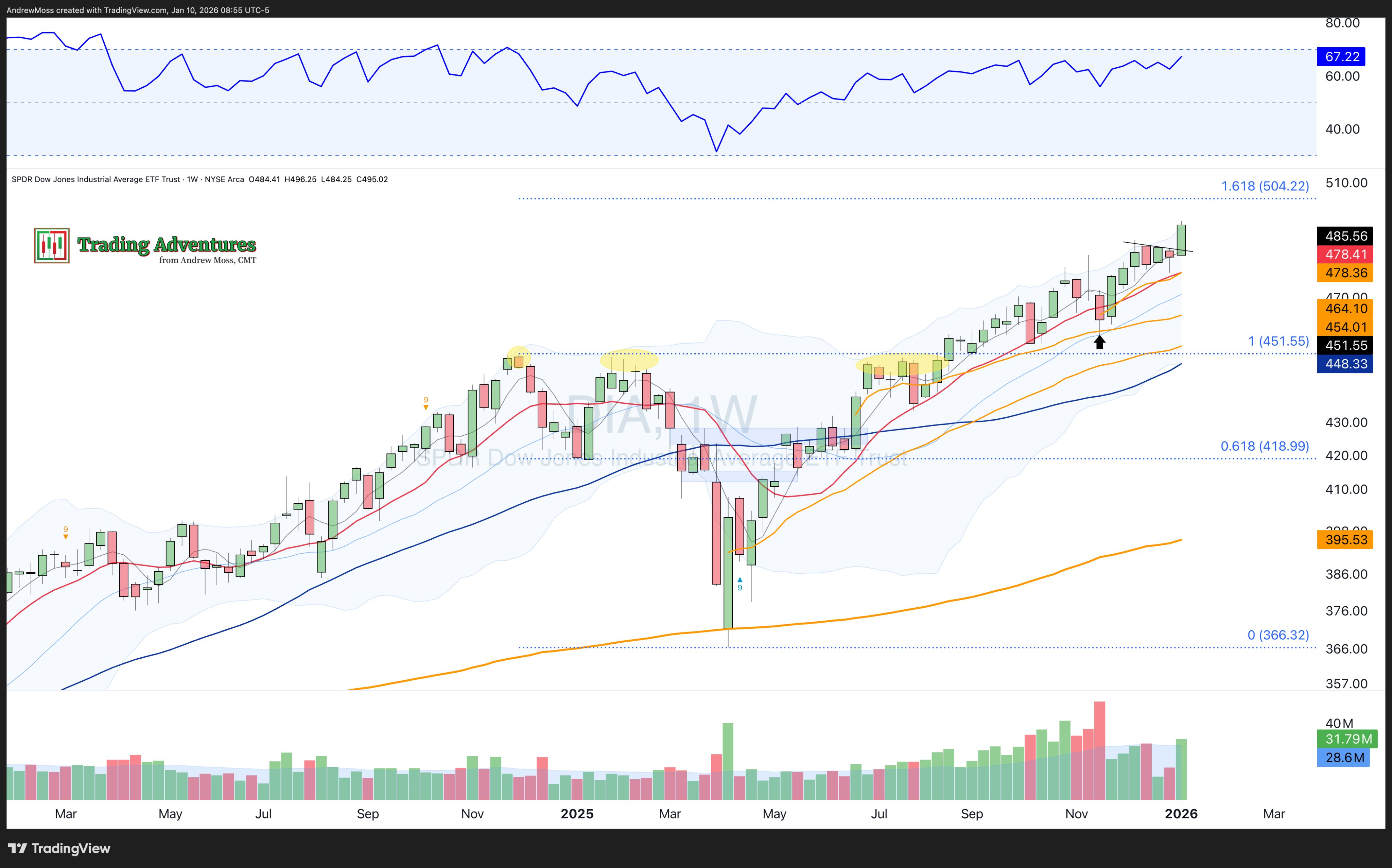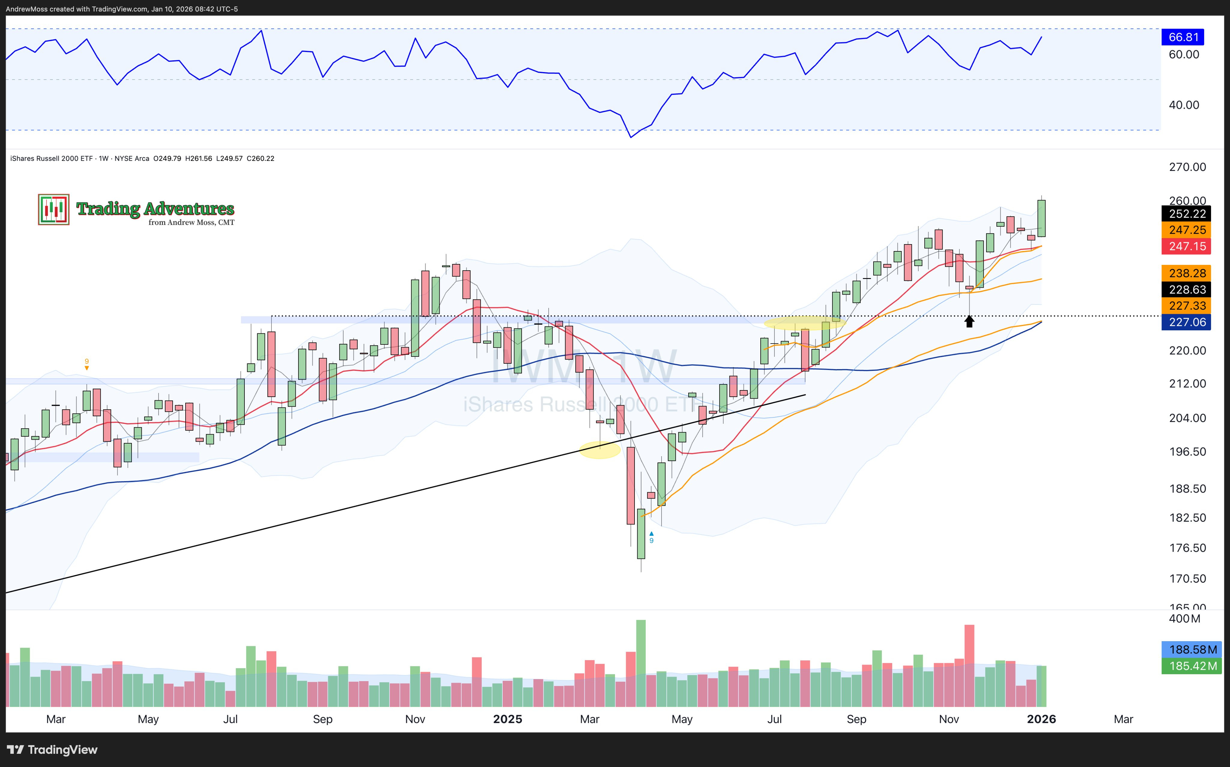 IWM delivered a powerful start to the year, jumping +4.6% from last week’s close — a textbook January Effect in action.