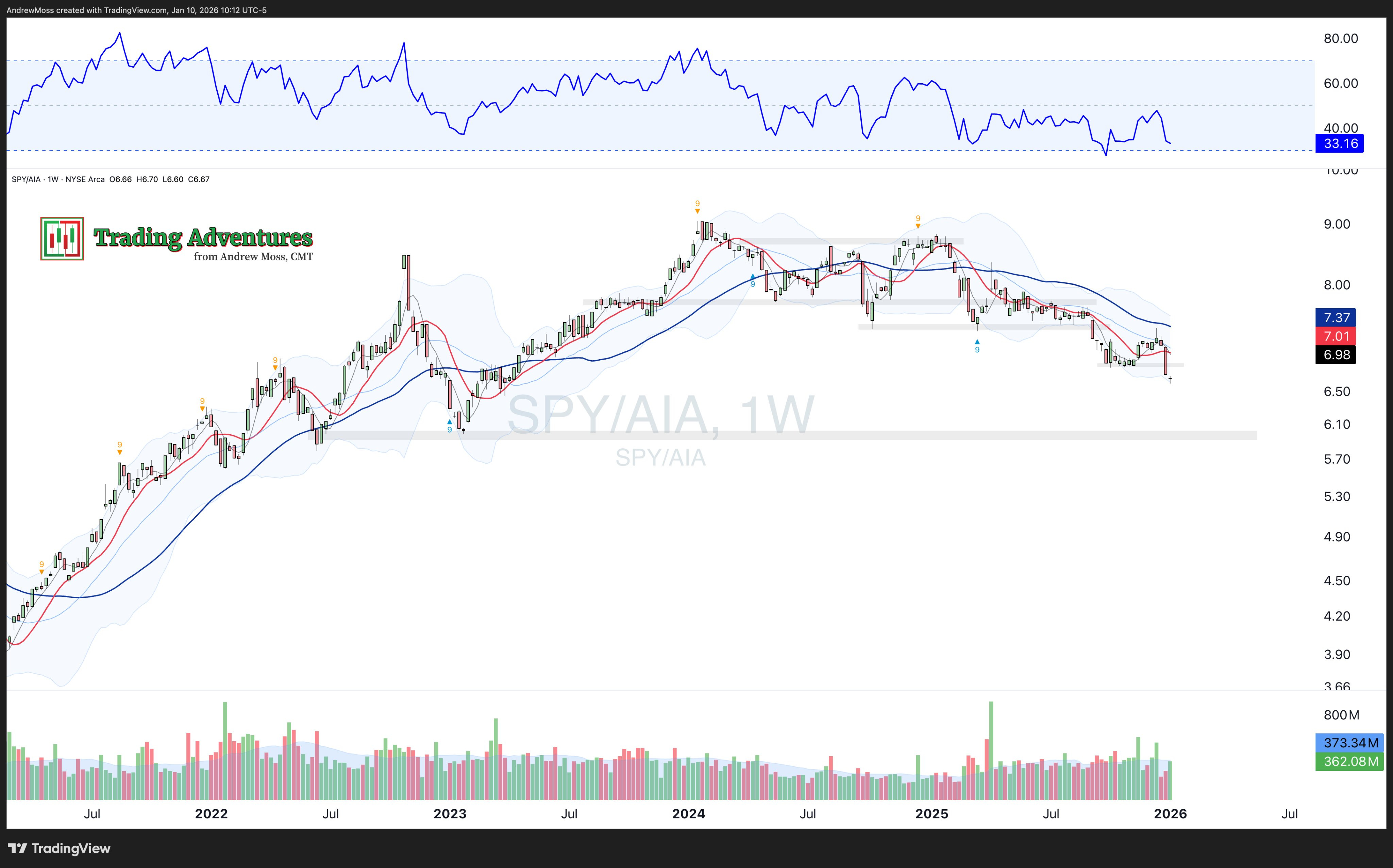 SPY / AIA: Lower highs & lows beneath AVWAPs — “descending the stairs”