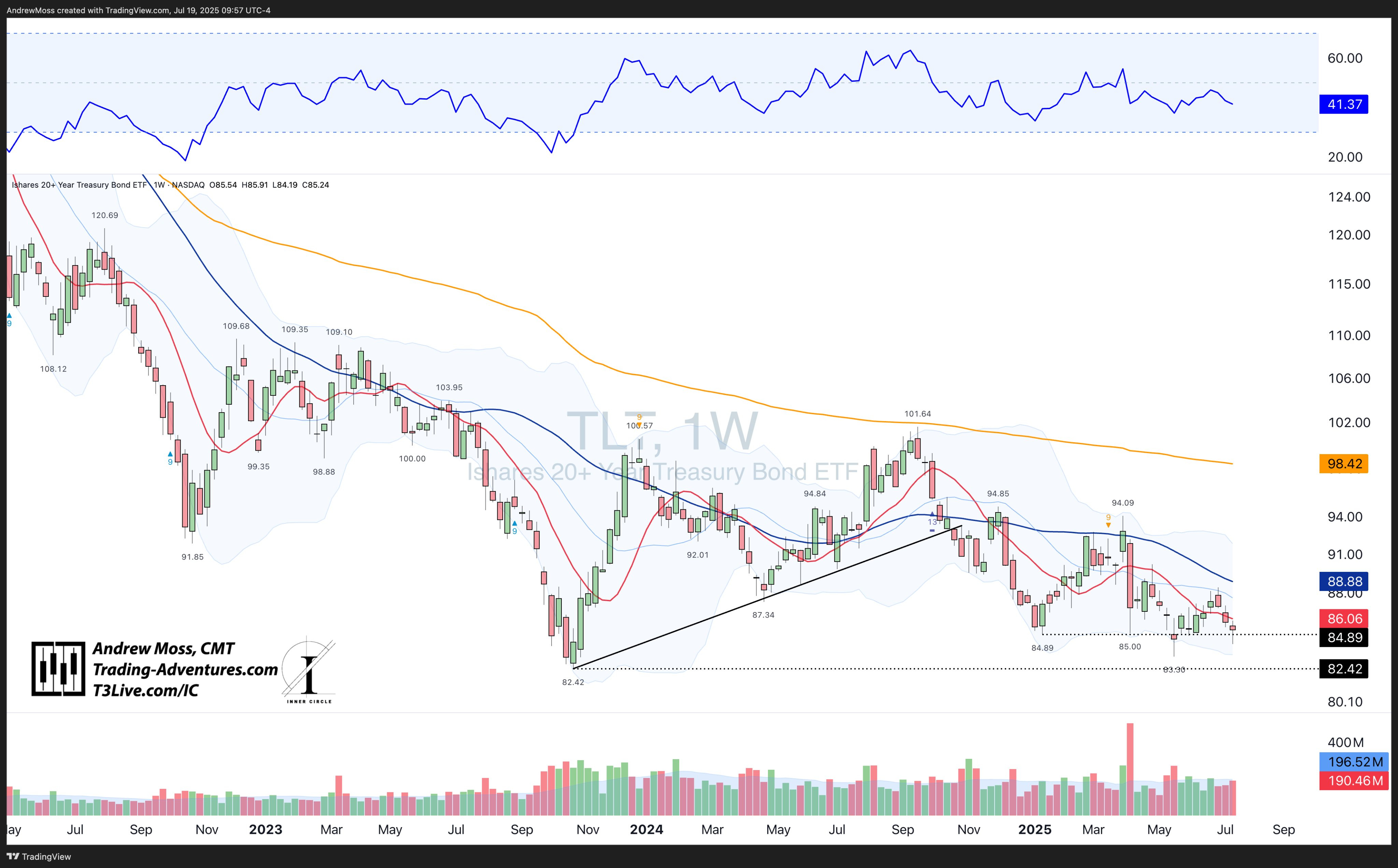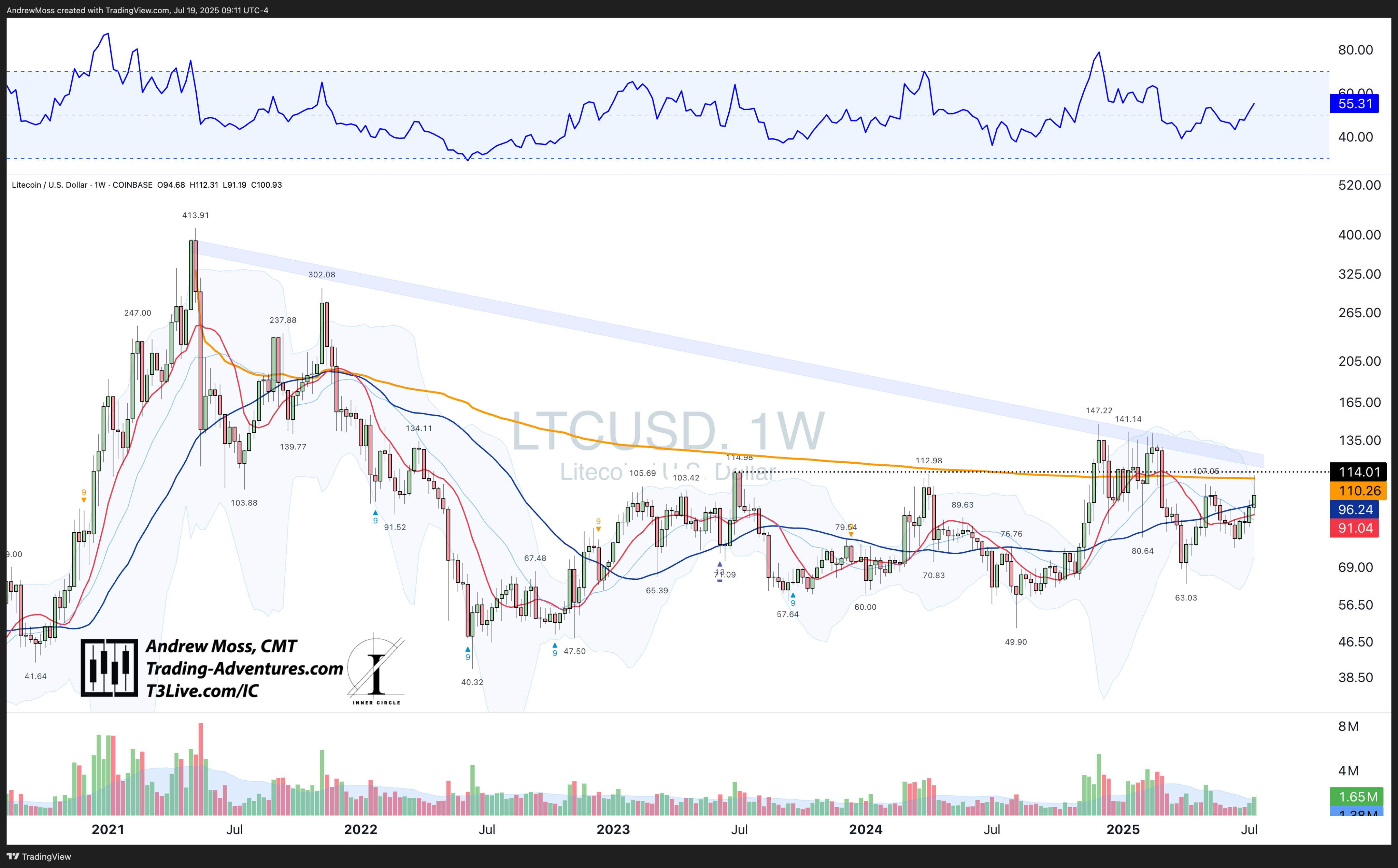 Litecoin joined the crypto surge — hitting $100 again and still wrestling with that level. This week’s high kissed AVWAP from the 2021 high at $110.26 — a key level to watch. Still below the long-term downtrend. Can it build on this strength?