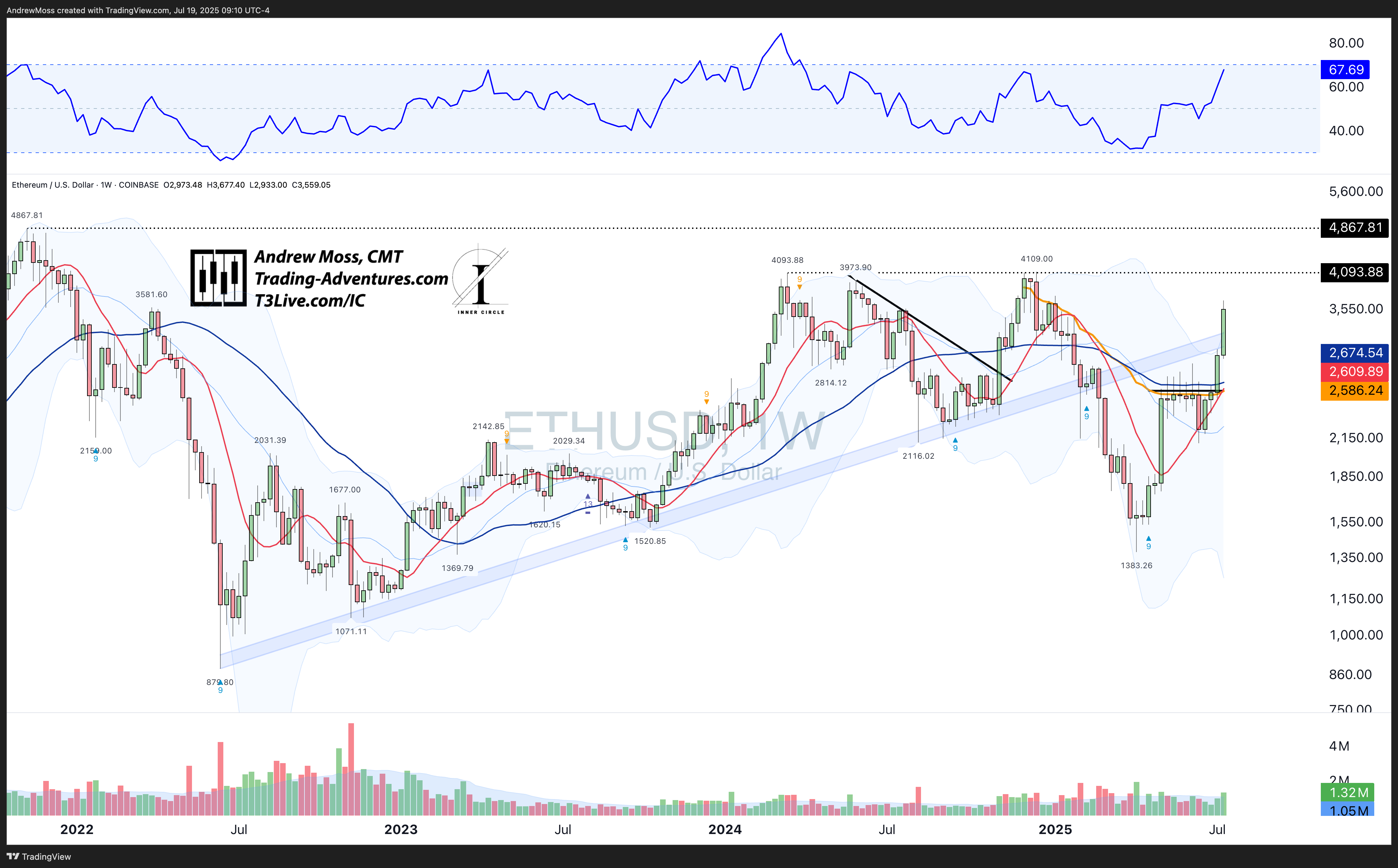 This marks a decisive move above key resistance near $3,200. RSI confirms the momentum — and unlike BTC, ETH has more distance before testing prior cycle highs.