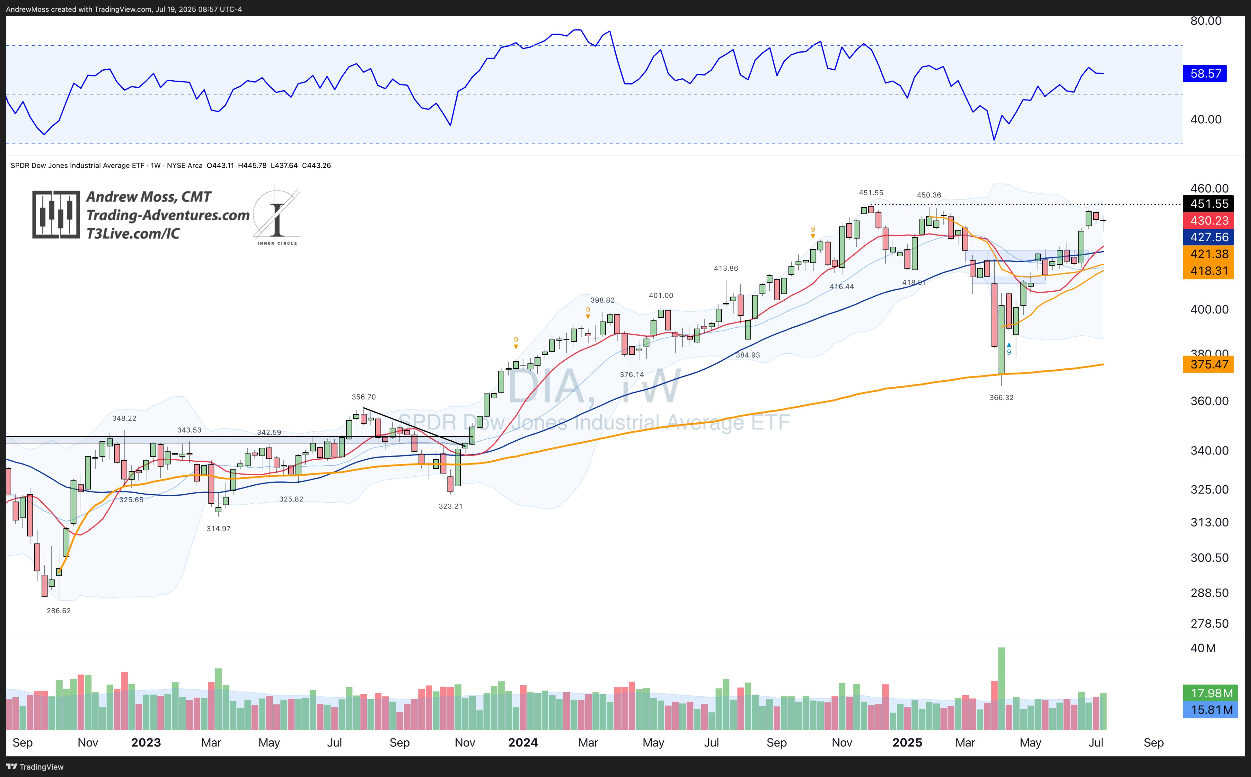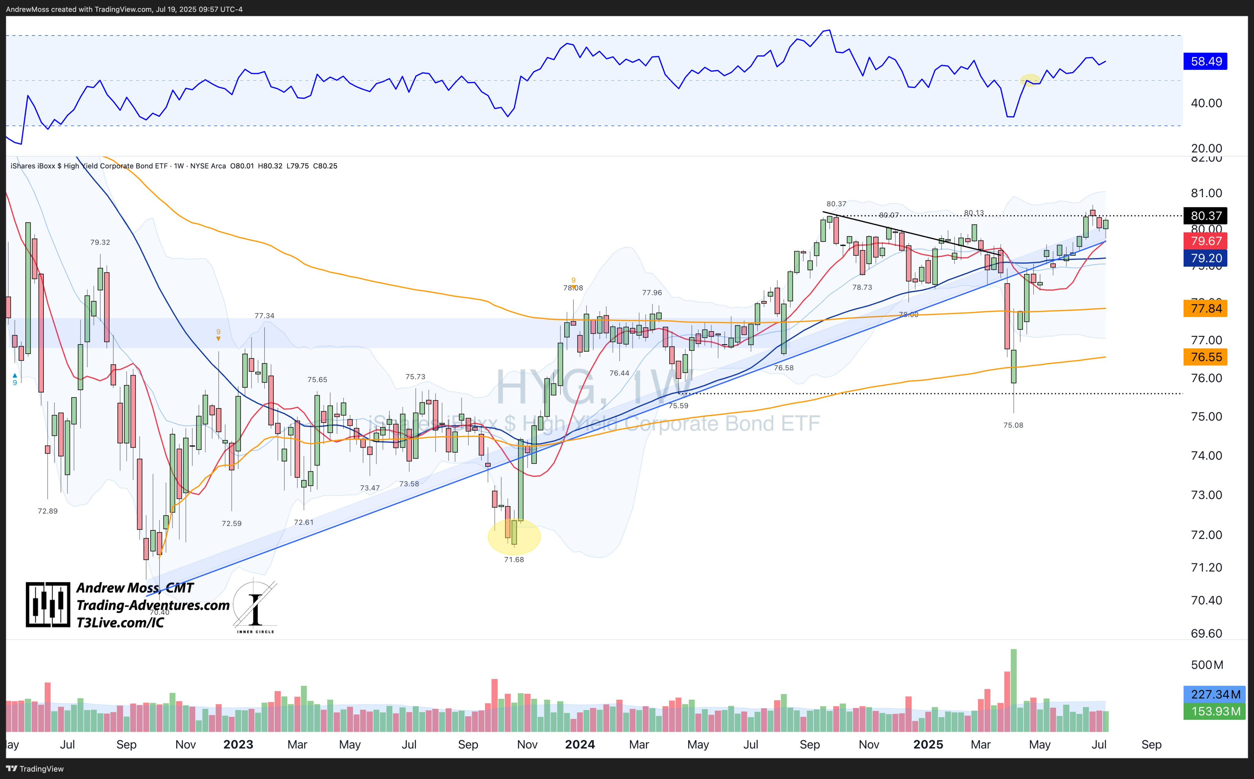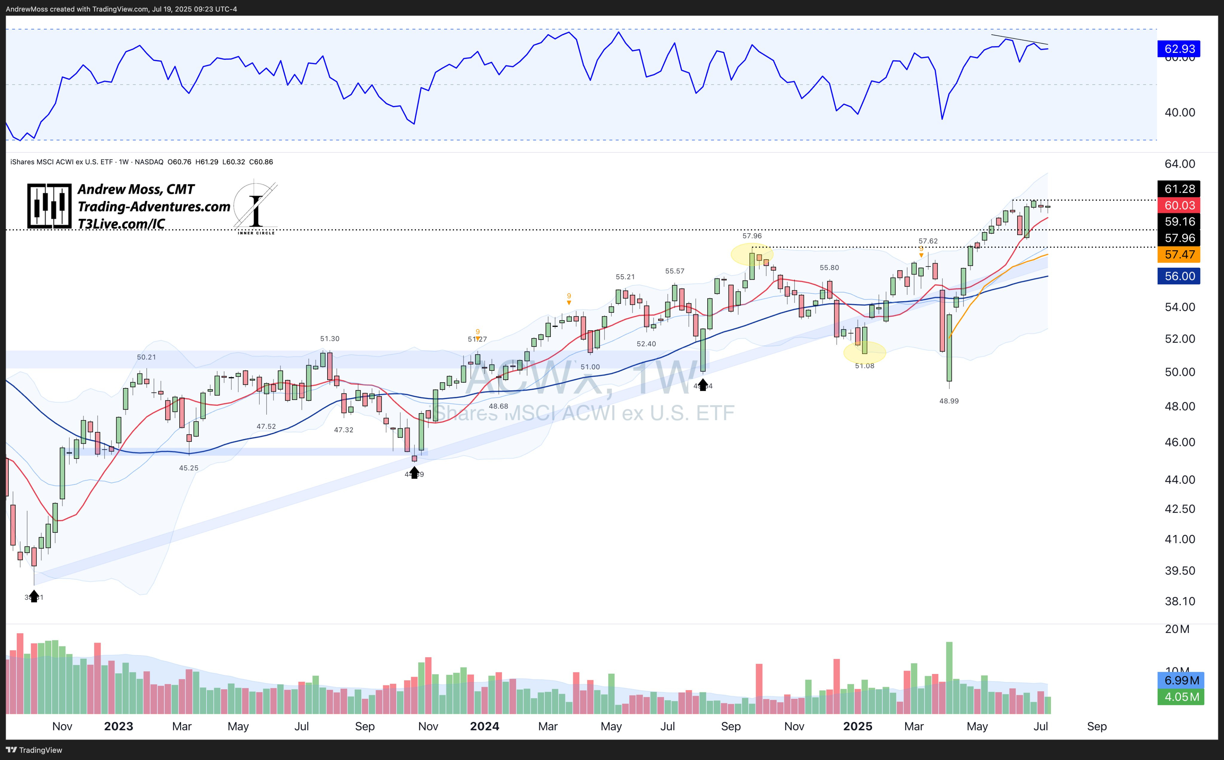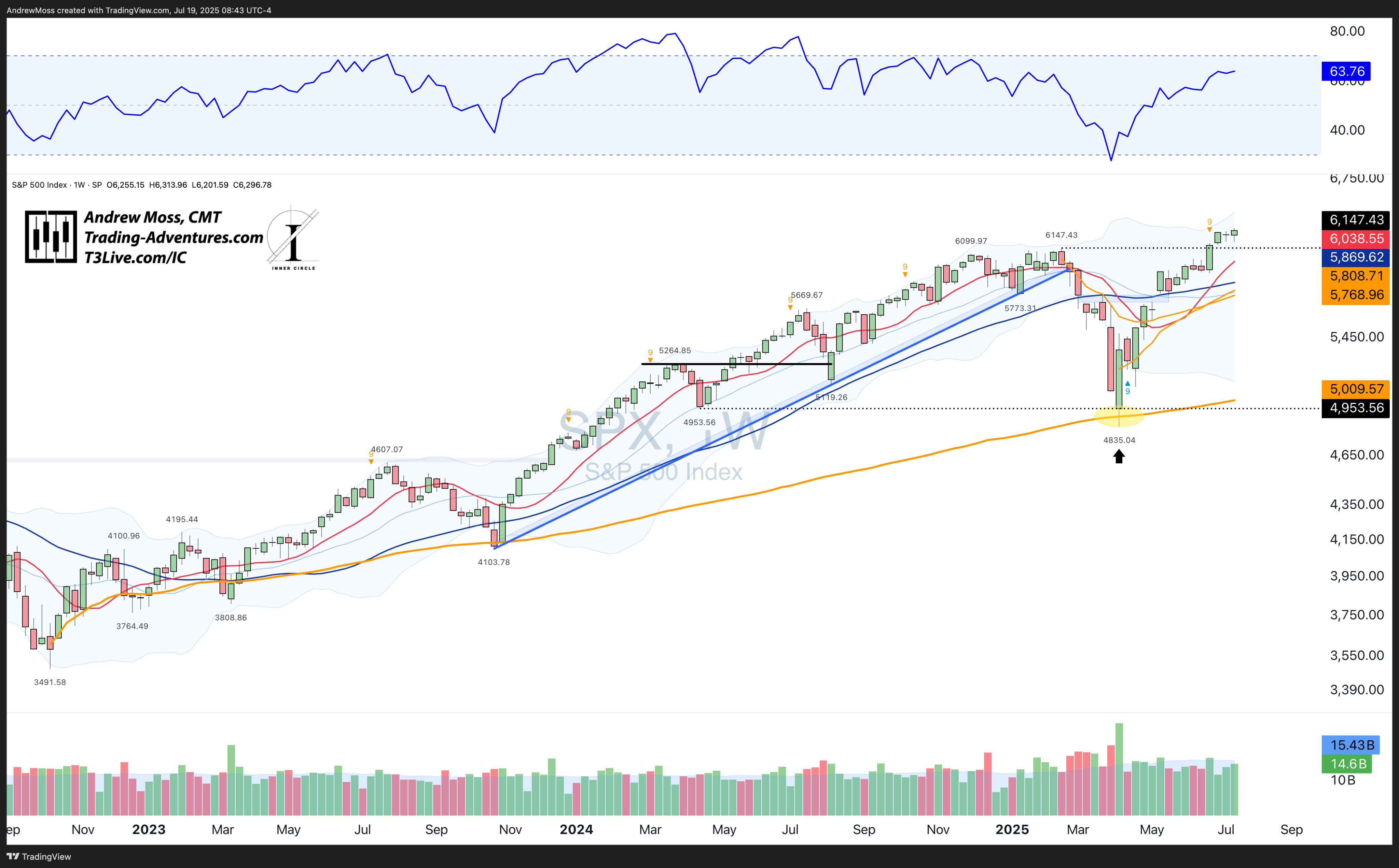 The uptrend remains firmly intact with steady gains, support from rising moving averages, and a bullish (but not stretched) RSI. New weekly closing highs keep confirming strength.