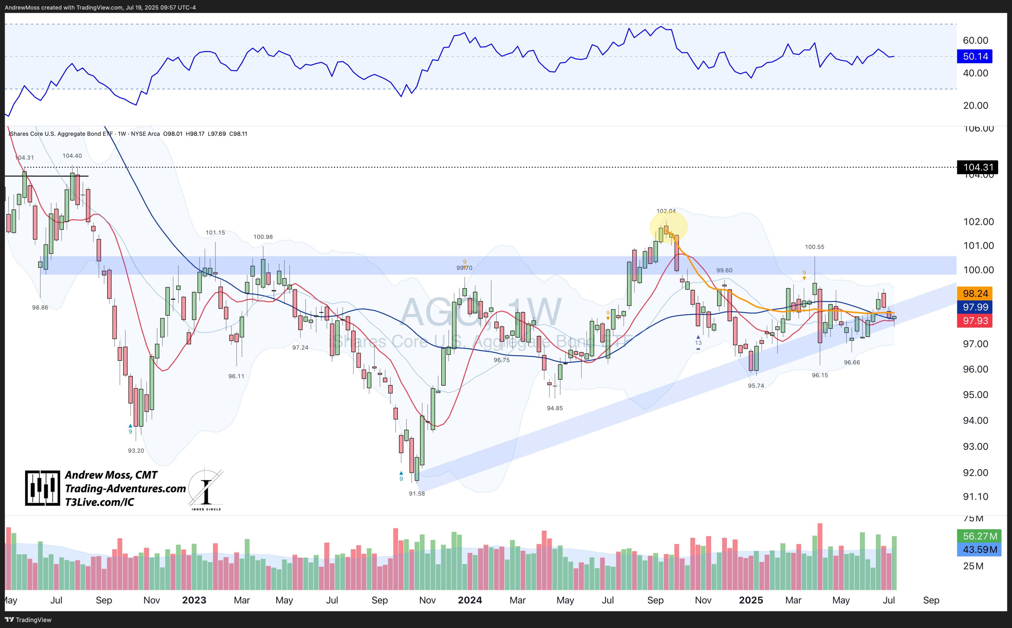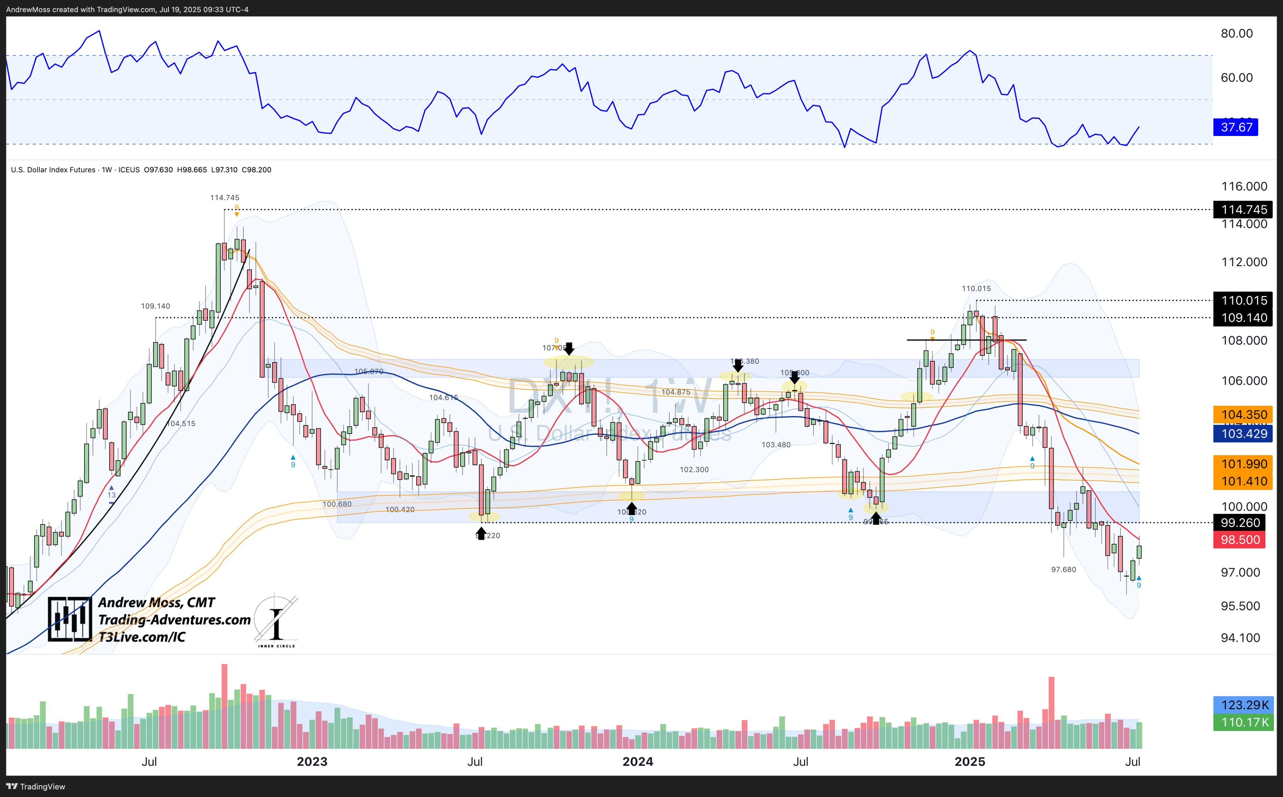 Second green week in a row — rare in 2025 — pushing back into the falling 10-week MA.