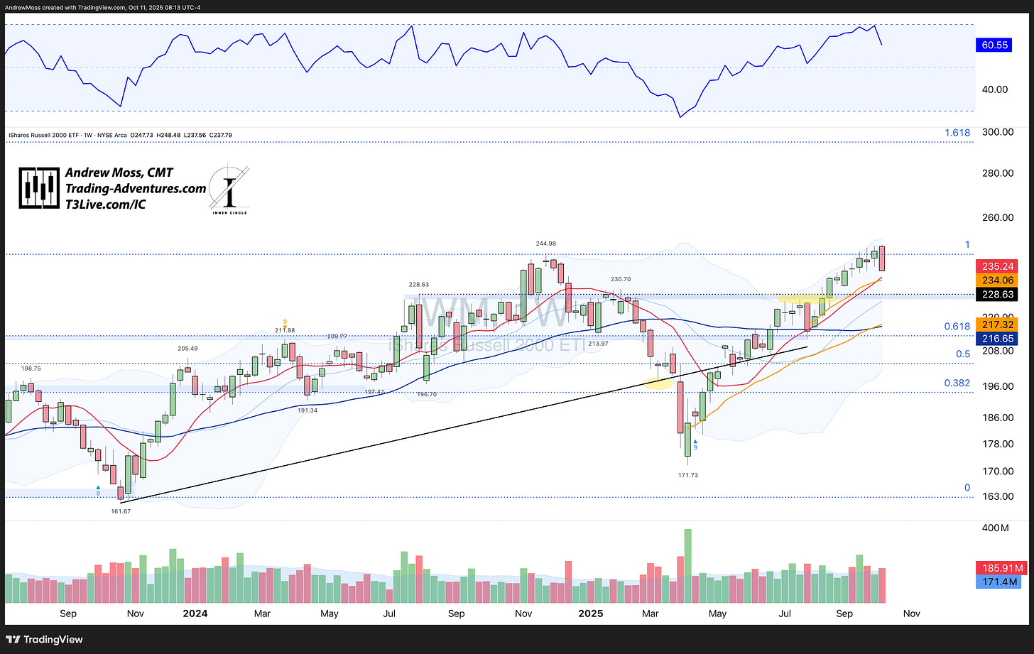 Russell 2000 (IWM): Back below the ~$245 breakout level â not a good sign. But itâs still above the 10âweek MA and AVWAPđ . That will likely be a critical test level. RSI at 60 and volume was a little heavy, but not a concern.