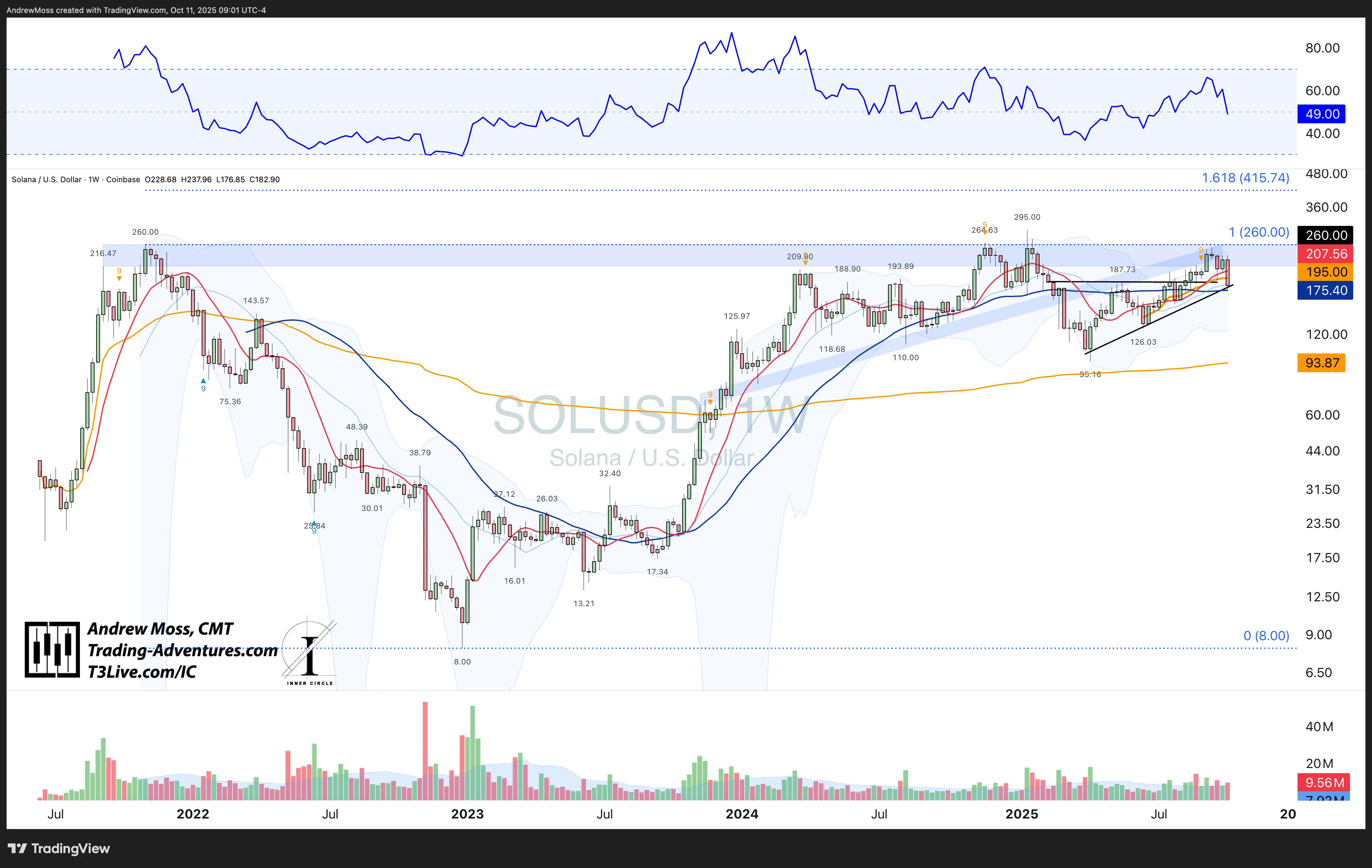 Solana (SOL) - Remains stuck â unable to move beyond $260. Now, can it hold the 40âweek MA and trendline while getting RSI back over 50?