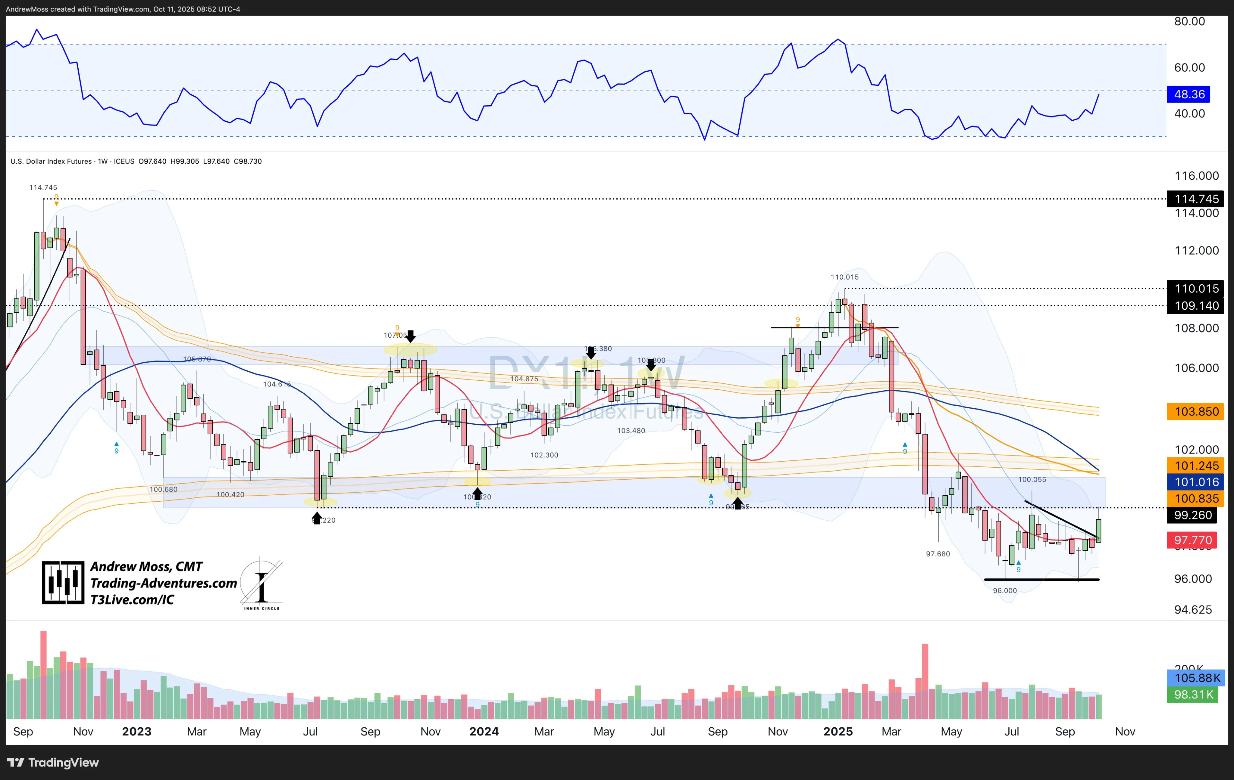 DXY / DX1! The Dollar had a breakout move and looks like it has bottomed for now. Strong move out of the pattern and above the 10âweek MA, finding some resistance exactly where it should â the bottom of the longâstanding range.