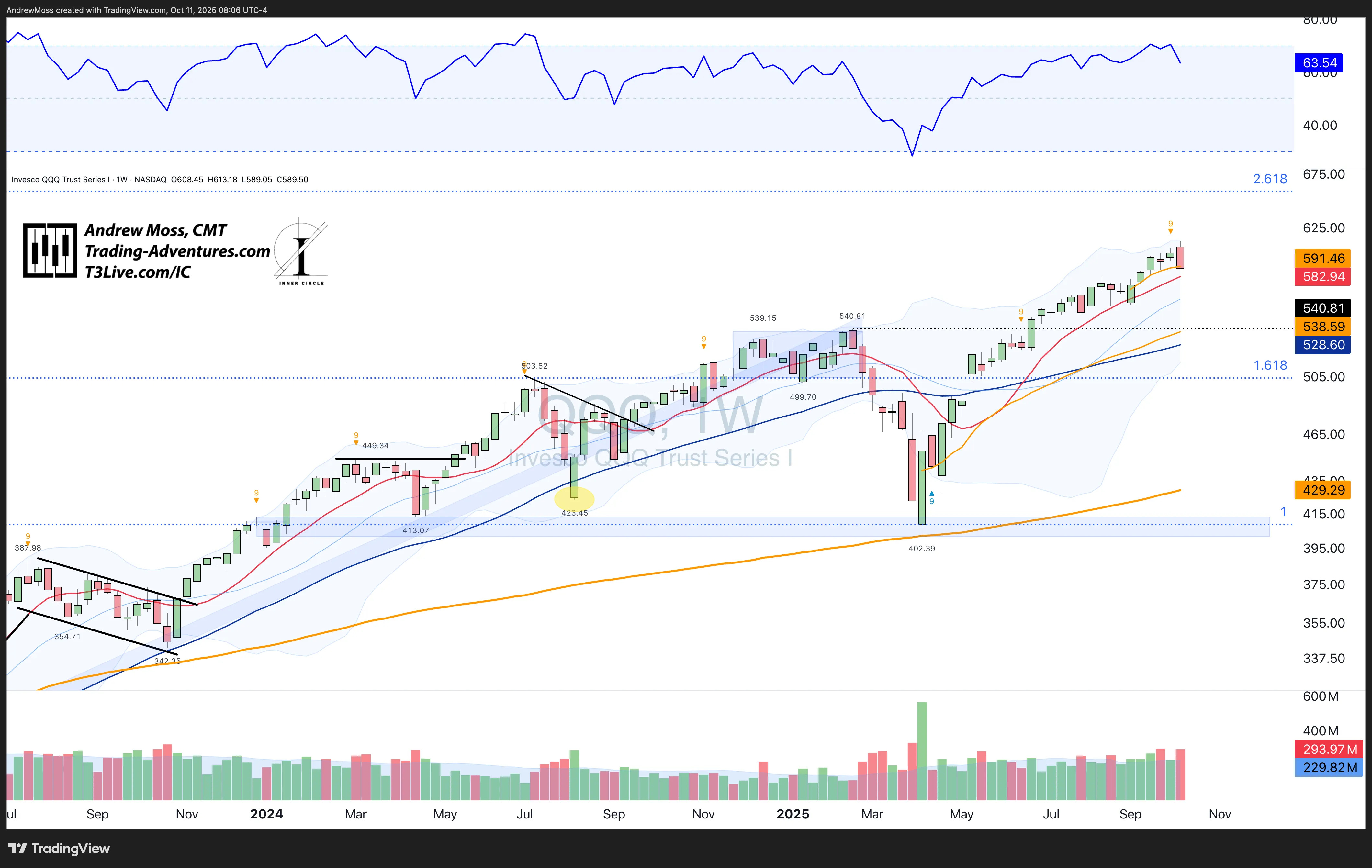 Nasdaq 100 (QQQ): Similar action on heavier volume, closing near the AVWAPđ from its earlier test of the 10âweek MA â which price actually hit in afterâhours trading yesterday. RSI finished at 63.5.