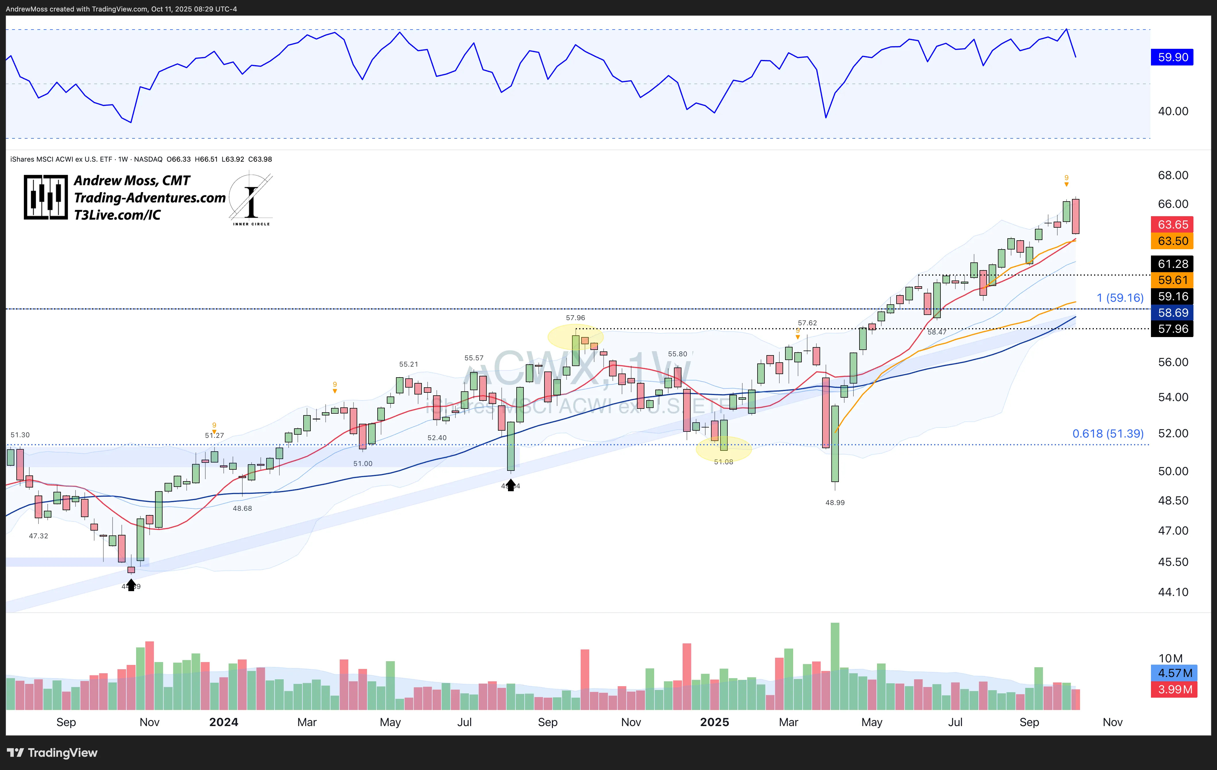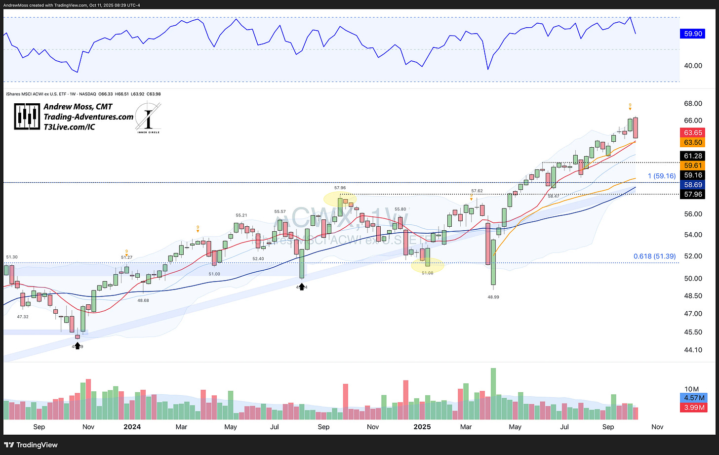 ACWX (exâUS): After last weekâs DeMark 9 sell setup (also present on SPX and QQQ), the Rest Of The World erased a monthâs worth of gains in one week. ~$63.50 will be an important test now. Thatâs the 10âweek MA and an AVWAPđ .