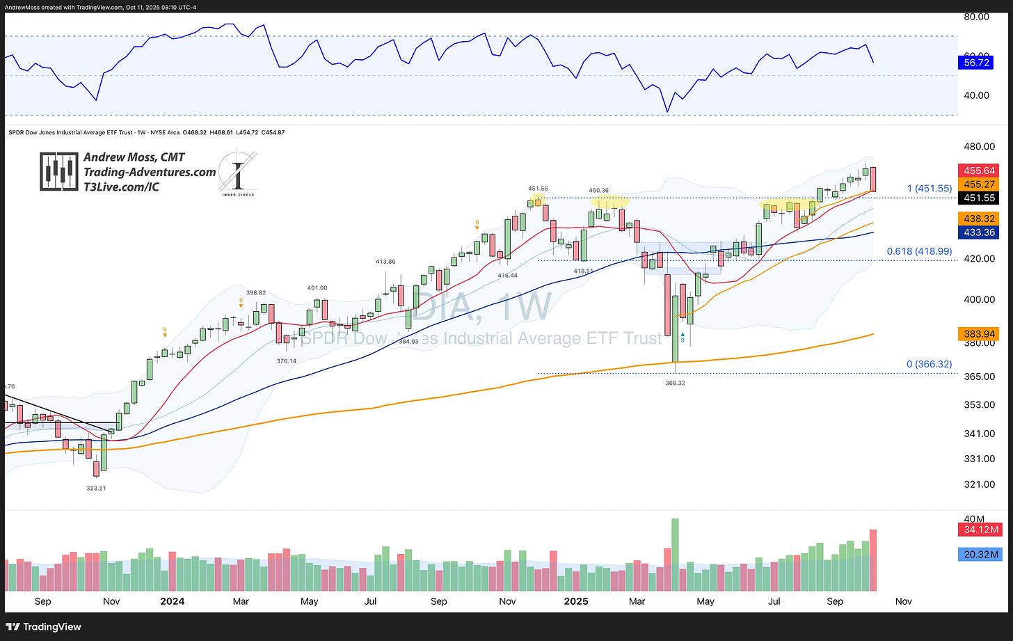 Dow Jones (DIA): Closed on its 10âweek MA and AVWAPđ from the previous test. RSI is a bit lower at 56, and volume was very heavy. The ~$451 pivot area is close by and will be an important level to hold.