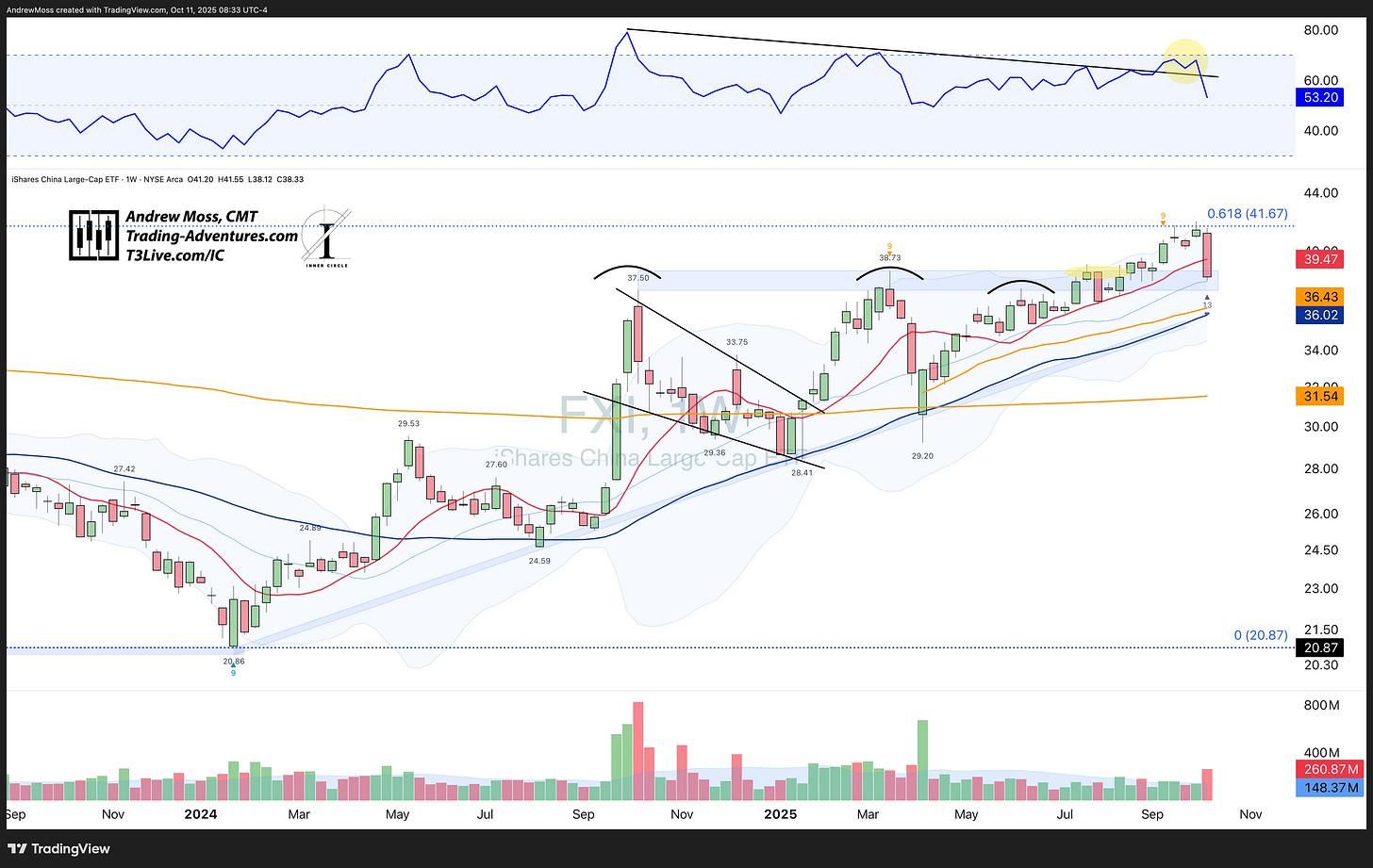 FXI (China): Stuffed at the Fib retracement. Now back below the 10âweek and into the middle of the BBands and pivot area. RSI also lost momentum and will test the midâline soon. Volume was nearly double the average.