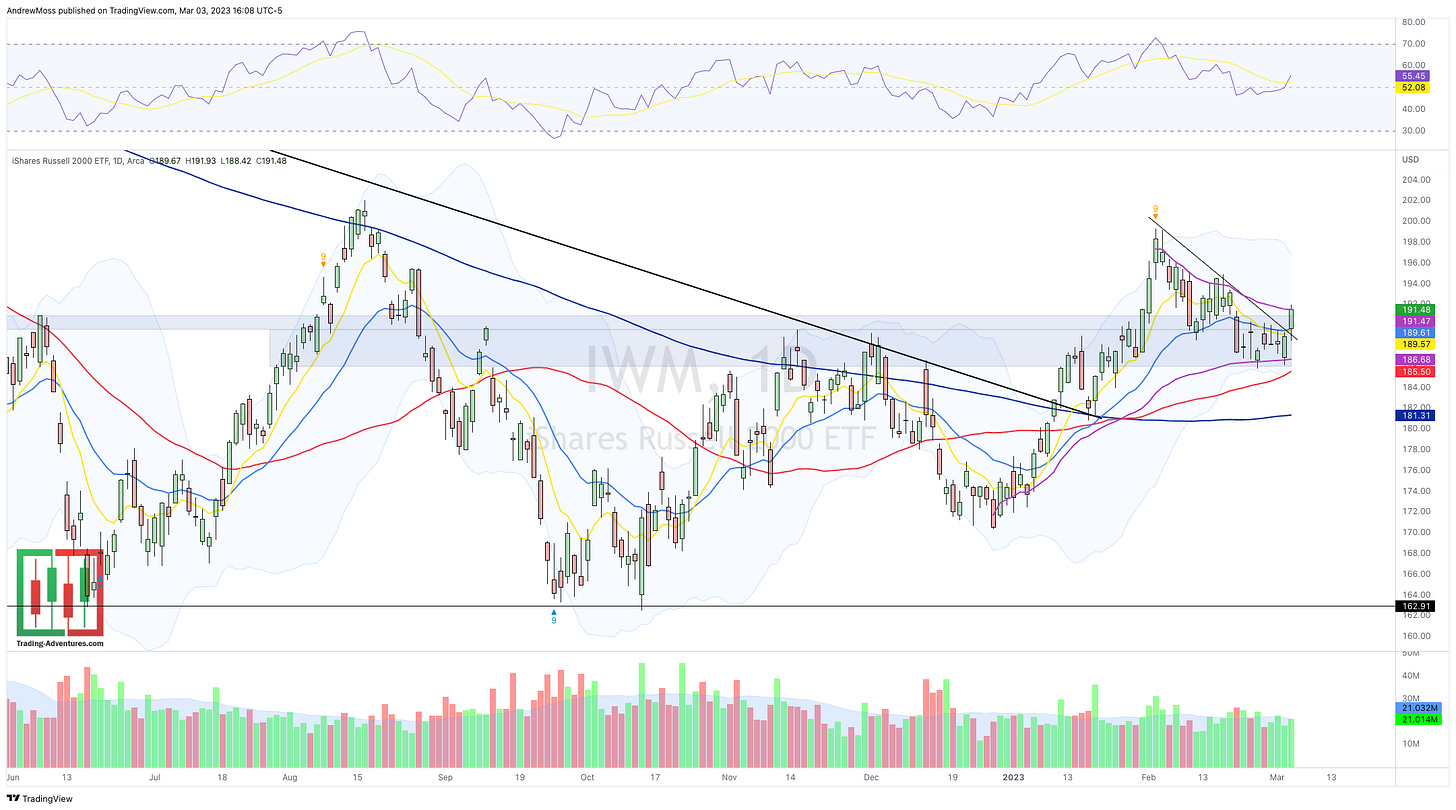 IWM is up and out of the congestion zone and very near its swing high AVWAP. Above that watch 198-200 for potential resistance.