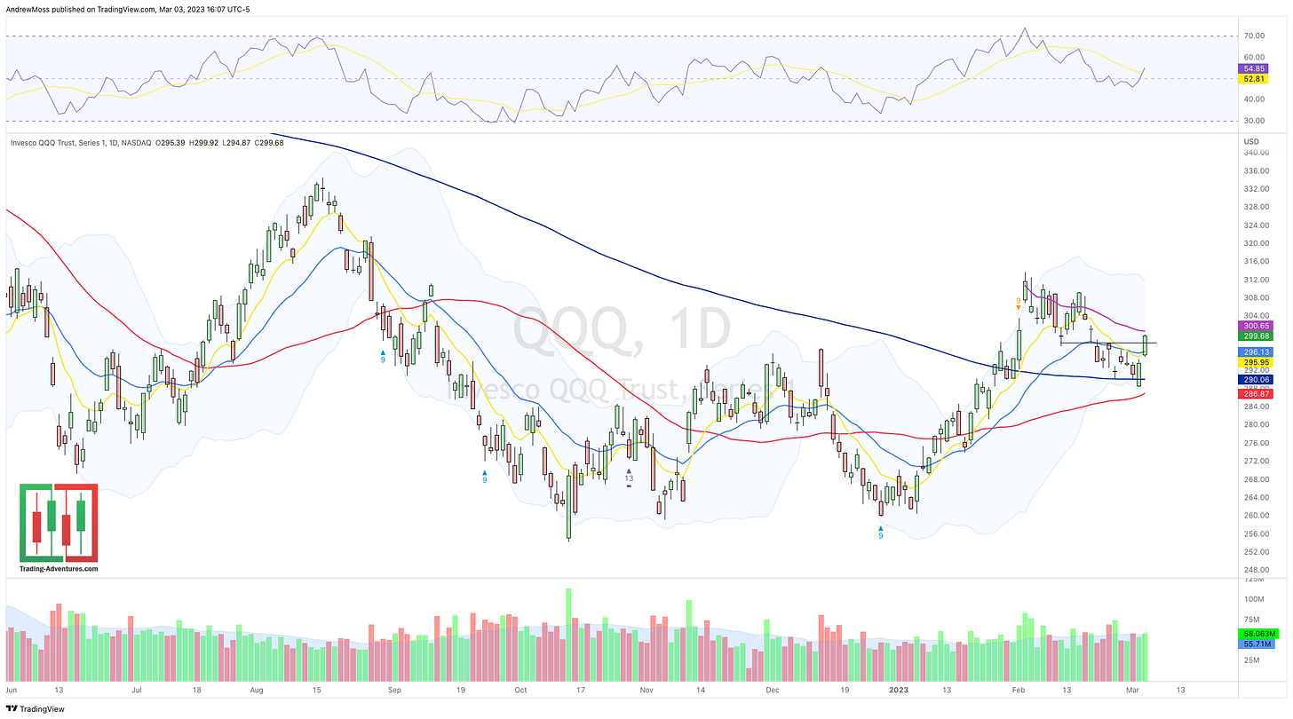 QQQ is back above the 8, 21, and 200 MAs (never crossed the 50), through 298, and is moving toward the swing high AVWAP at 300+. The swing high around 312 is a spot to watch.