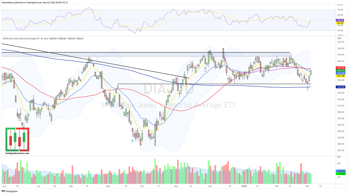 DIA - Dow Industrials got saved right when they needed it most. The index is back above the 8 and 21 EMAs and now must deal with the 50-day MA and the swing high anchored VWAP.